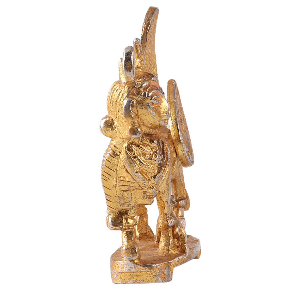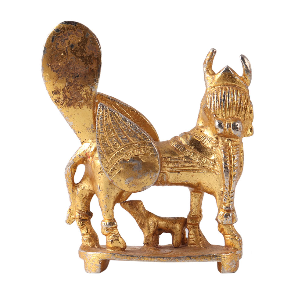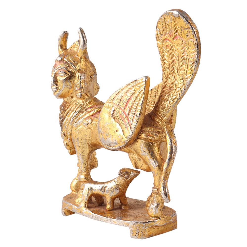 A high quality golden brass statue of the cow Kamdhenu, traditionally made according to ancient methods. Kamdhenu, also known as Surabhi, is the mother of all cows in Hinduism and originally resides in heaven. She is generally depicted as a cow with a female head, wings of the bird and the tail of the peacock. Place the Kamdhenu cow in the northeast direction or in the Ishan Kon of the house to bring wealth and luck into your life. Add this incredible statue to your collection or gift it to your loved ones on special or festive occasions.
