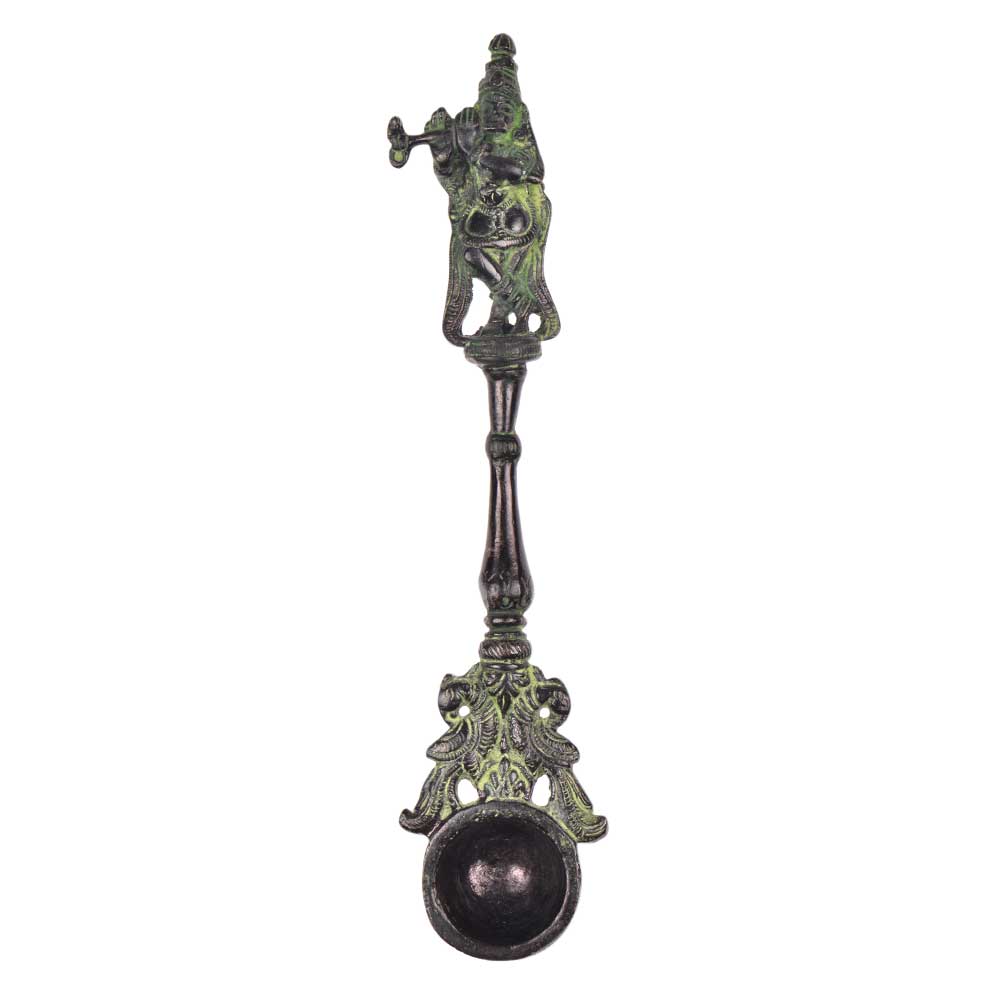 This is an intricately carved pooja spoon made of brass is used for offering worship during puja or havan . The spoon has a small bowl to fill holy water or oil with a decorative finial with Krishan playing Flute figurine design on the top and bottom of the spoon . Use it as a home décor product or as a gifting option for family and friends