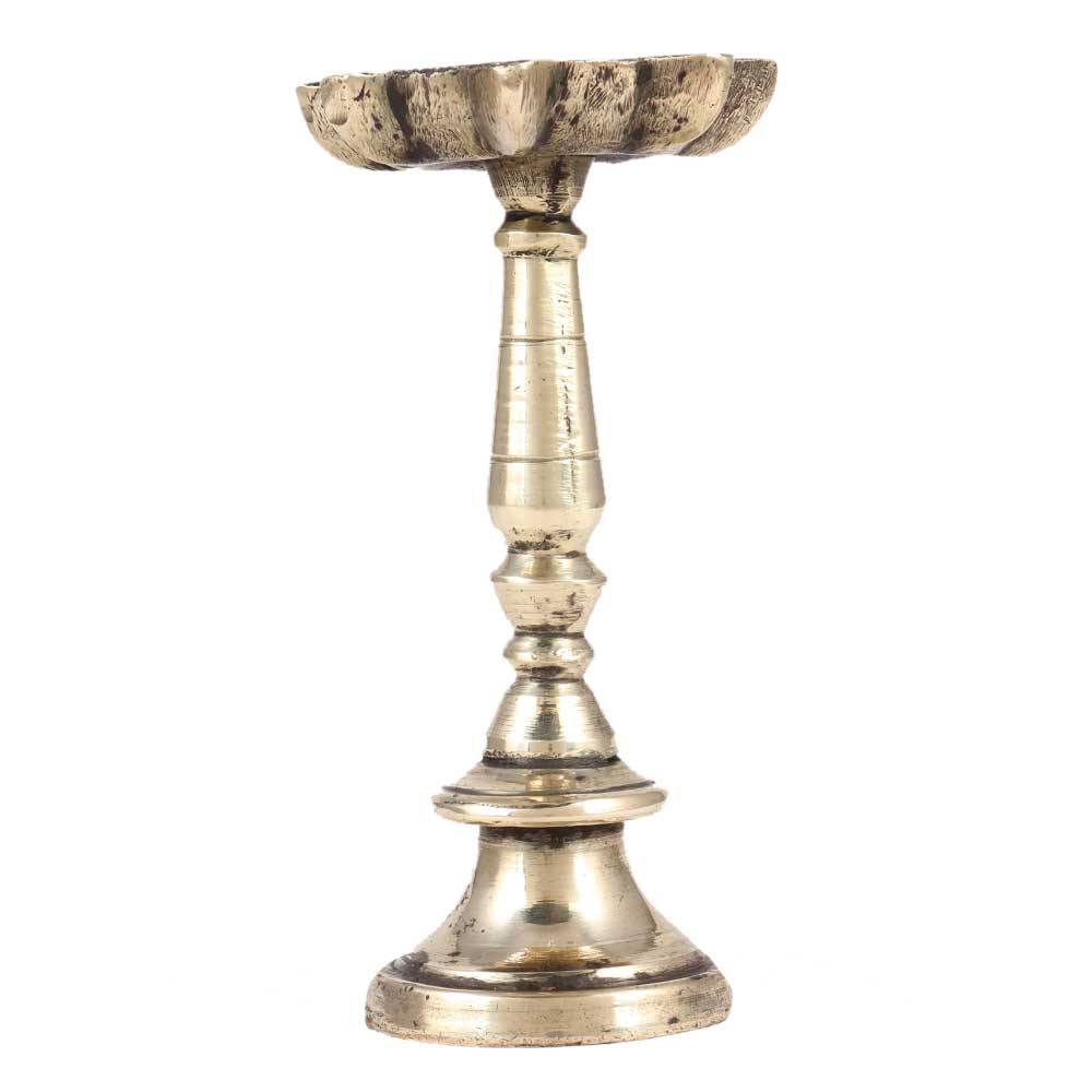 Tall brass kuthu vilakku oil lamp from Karnataka with seven loops to illuminate the wicks immersed in oil and positioned on a graceful brass and gold patina finished pillar with soft edges and corners hand made by craftsmen from India's countryside. The liquid pan is completed with intricately carved bands and the lamp rests on an intricately designed round raised platform using a metal casting technique that follows century-old traditions.