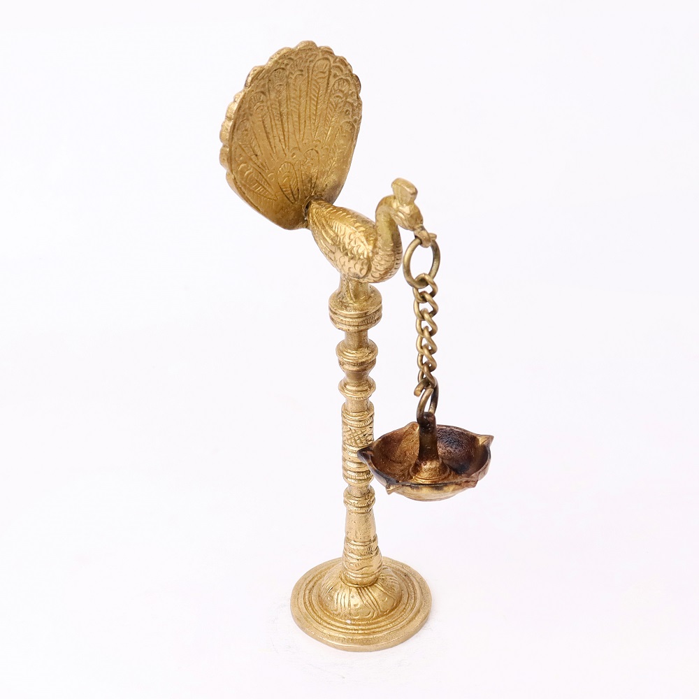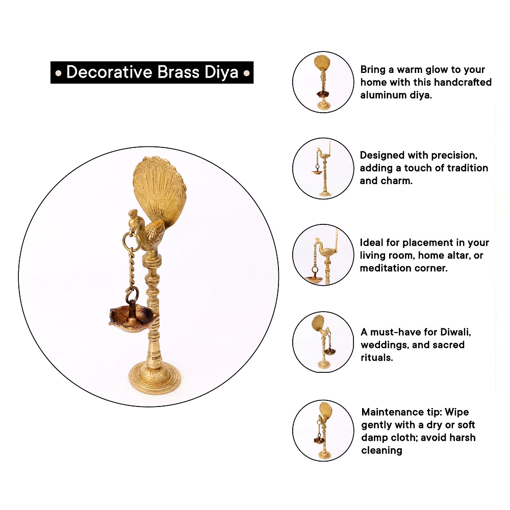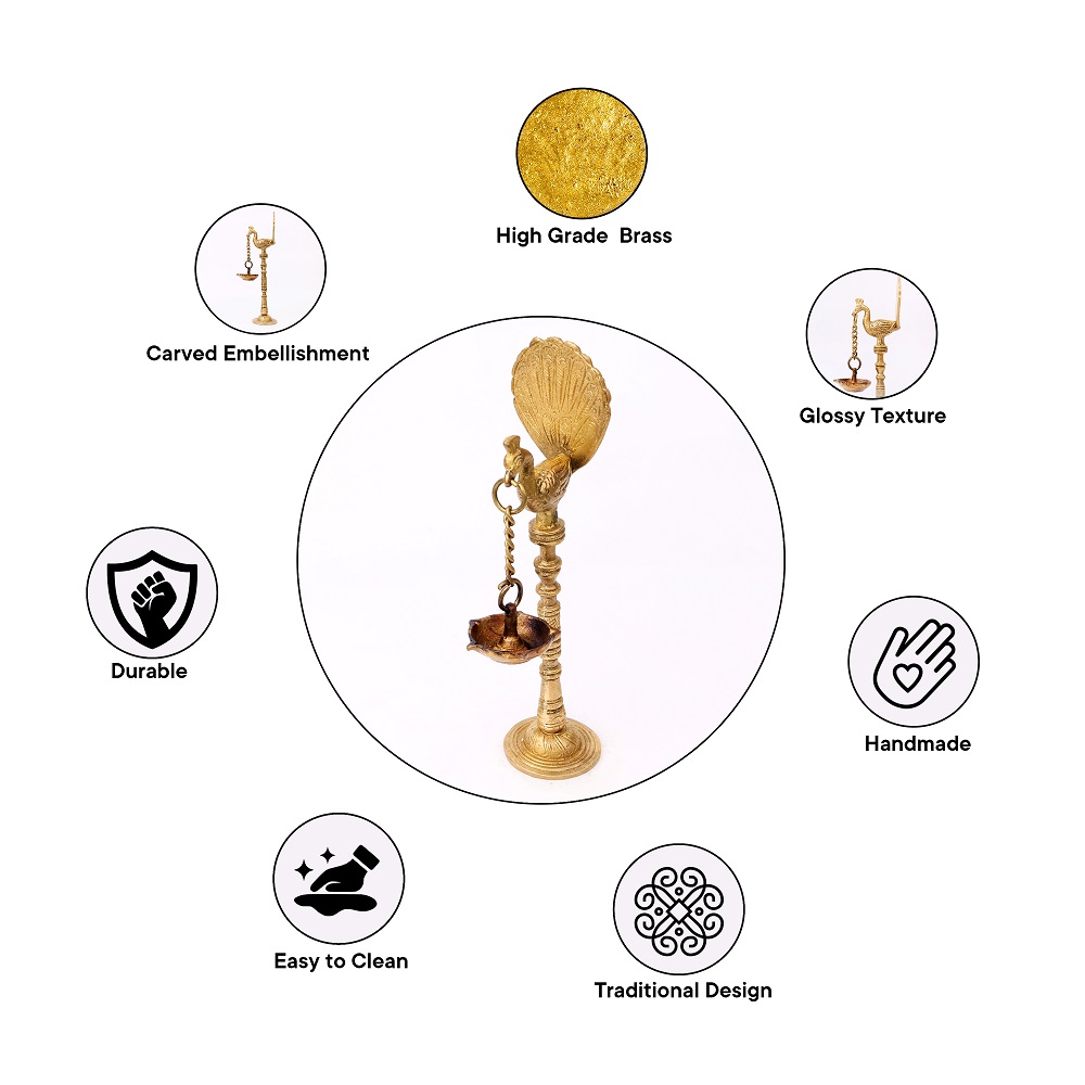 Even when not in use, this Brass Kuthu Villaku lamp serves as an exquisite decorative item. Its stunning peacock design and traditional style add a touch of regal beauty to any room. Whether displayed in the living room, pooja room, or hallway, this lamp becomes a focal point that enhances your home’s cultural ambiance.