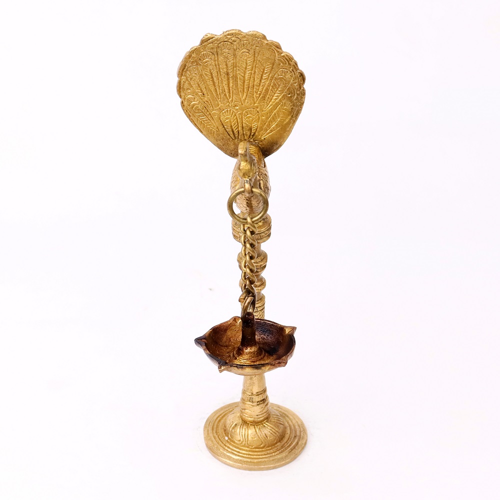 Made from high-quality brass, this hanging oil lamp is expertly designed to create a captivating light display. The peacock design adds an elegant and artistic touch, while the classic Kuthu Villaku shape enhances the lamp's cultural significance. This beautifully crafted lamp is a perfect blend of tradition, spirituality, and aesthetic appeal.