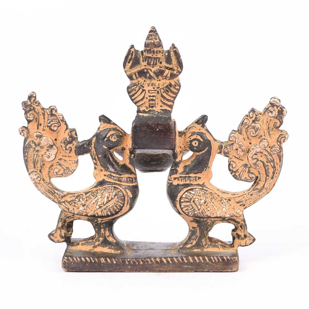Heritage Brass Lamp of Two Peacock Holding Lord Ganesh At Center Made in Ethnic Brass Patinated in Red. This Oil Lamp An Ideal Decoration During Diwali and Other Religious Occasions.