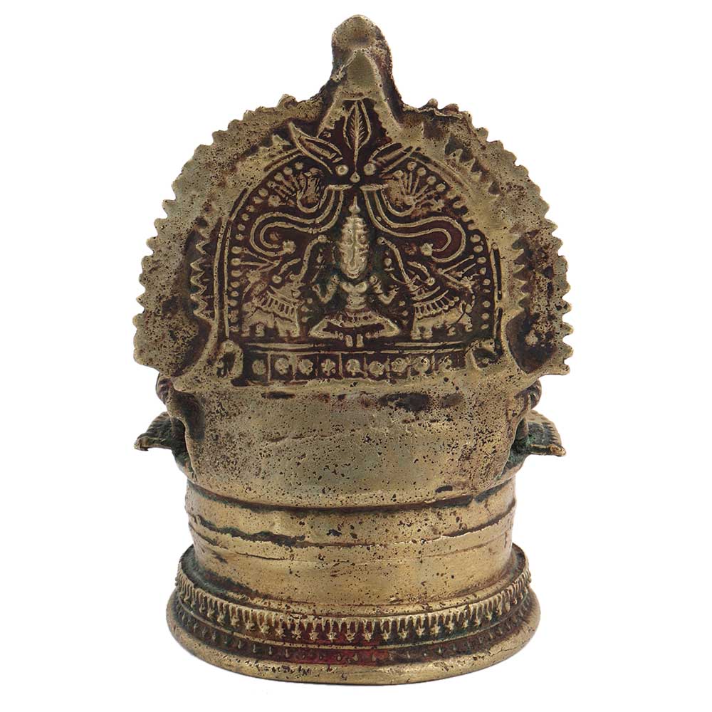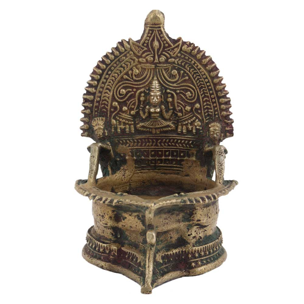 An artistic spiritual Brass Laxmi oil lamp curved in classic traditional design with goddess Laxmi with two jumbo elephants on the either side .Goddess Lakshmi is Hindu Deity of wealth & prosperity. It is Believed that, if you light this lamp in your home office,