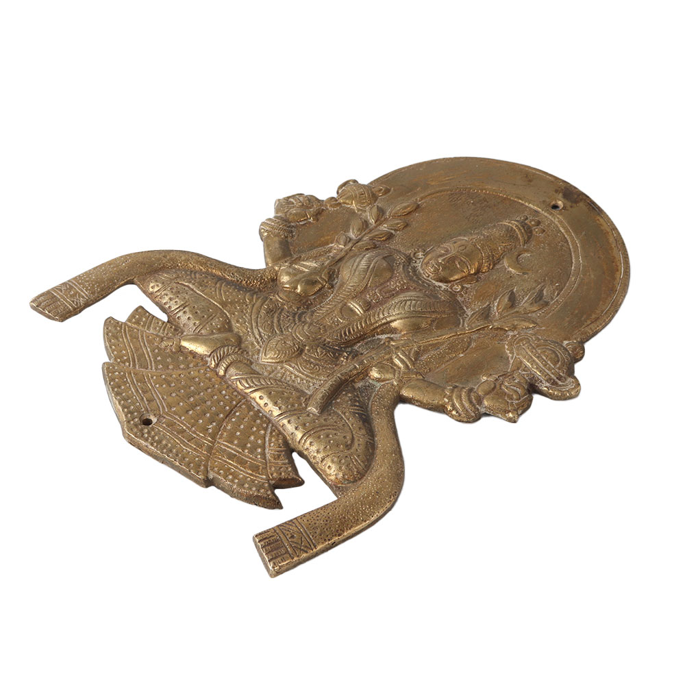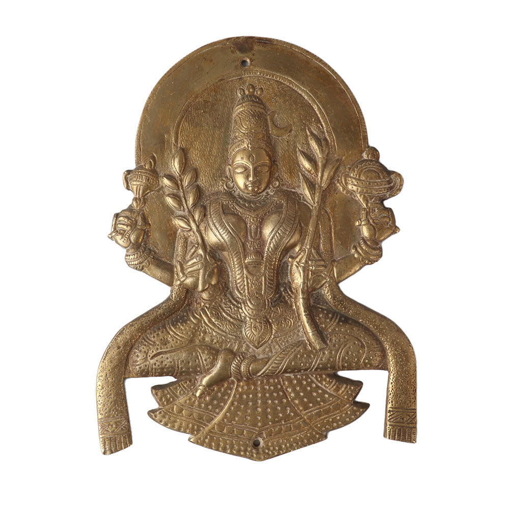 This is an antique Hindu Goddess Lakshmi plate. Since the pre-Buddhist period, Goddess Lakshmi, also known as Sri Lakshmi, has been one of the most popular and widely worshiped goddesses in Hindu tradition. According to the first legend, Lakshmi was born as a result of Prajapati's penances, and she represents ten qualities and objects, including food, royal power, universal sovereignty, noble rank, power, holy brilliance, kingdom, fortune, bounteousness, and beauty.