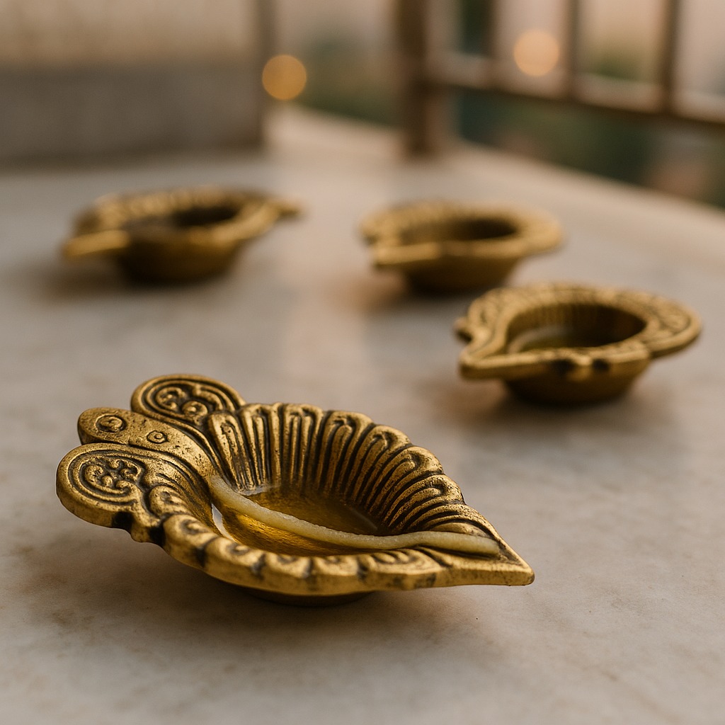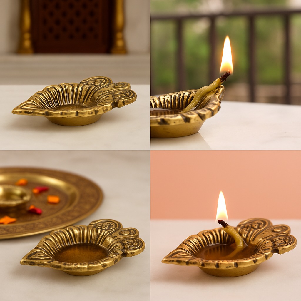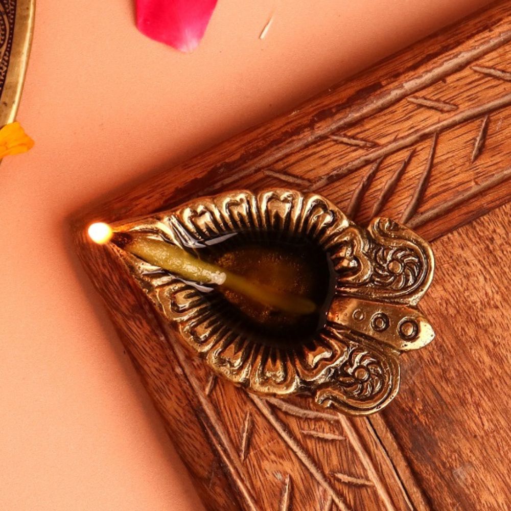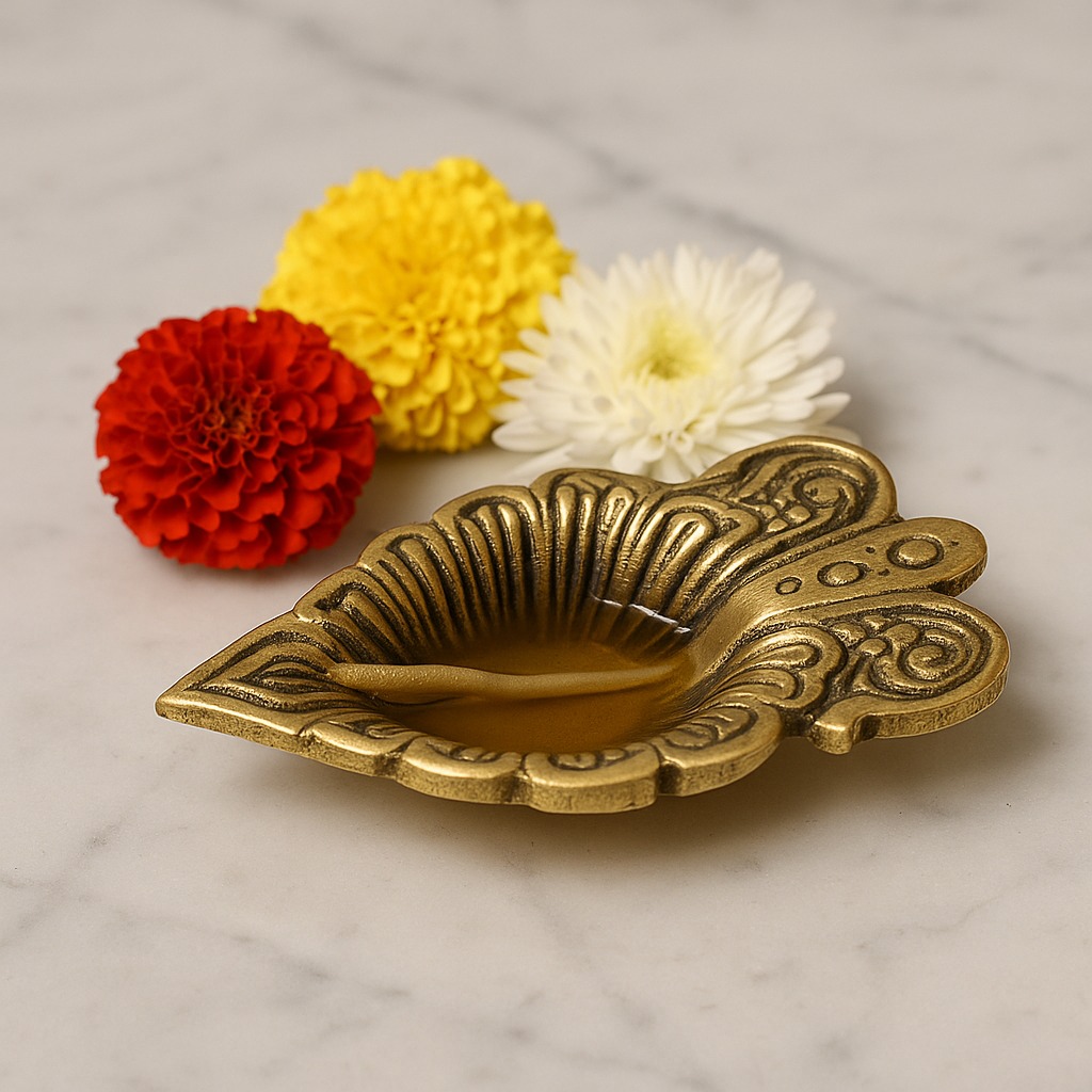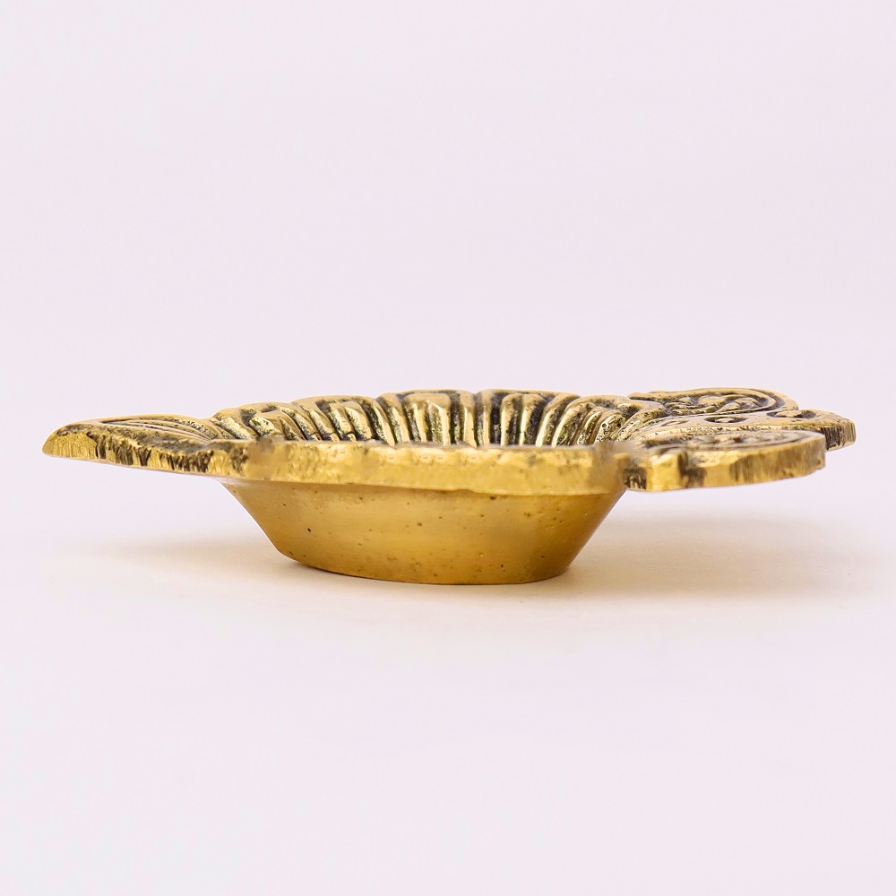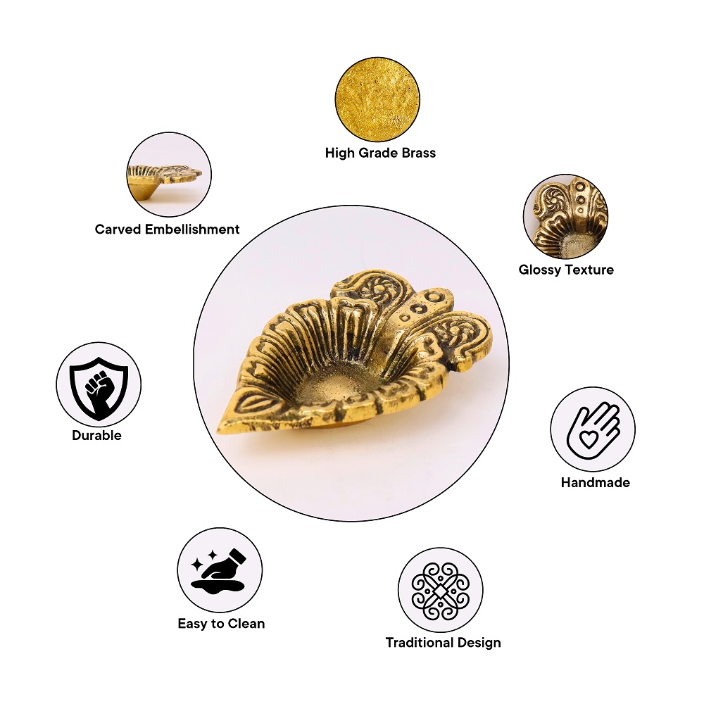 Illuminate your sacred rituals with the Brass Leaf Oil Lamp with Intricate Design, a diya that reflects the beauty of nature through its leaf-inspired artistry. Symbolizing growth, renewal, and divine energy, this diya adds elegance and auspicious charm to mandirs, puja thalis, and festive décor. The golden brass finish enhances its timeless appeal, making it a perfect blend of function and tradition.