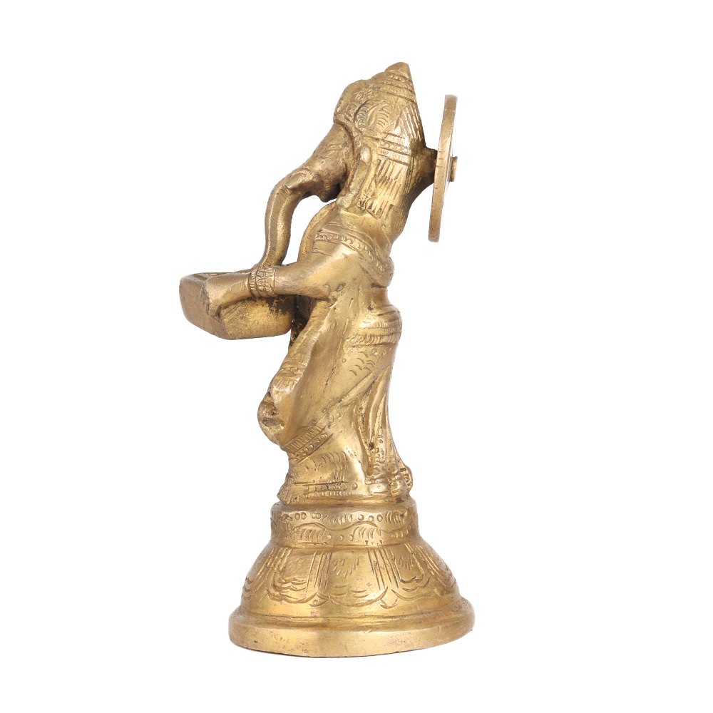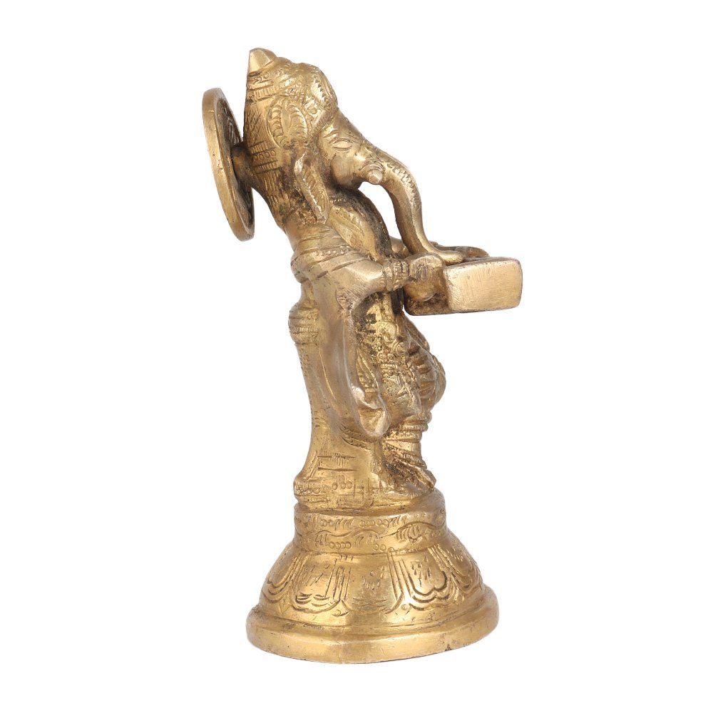 This brass statue of Lord Ganesha is a beautiful depiction of the Hindu God, renowned for his wisdom, intellect, and love of music. In this statue, Lord Ganesha is shown playing the harmonium, a popular Indian musical instrument. The statue's golden finish adds to its beauty and radiates a sense of positivity and warmth. The statue is ideal for placing in prayer rooms at home, office, restaurant, hotel, or gym, creating a peaceful and calming environment. Lord Ganesha is believed to be the remover of obstacles and is revered by Hindus all over the world. The statue's intricate detailing and expert craftsmanship make it a valuable and remarkable piece of art, sure to inspire and uplift anyone who sees it. Gift it your loved ones on special, festive and auspicious occasions.