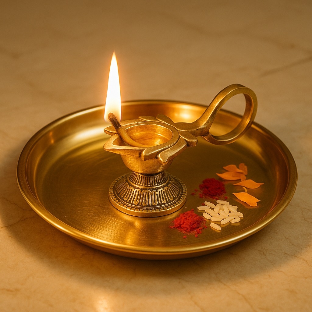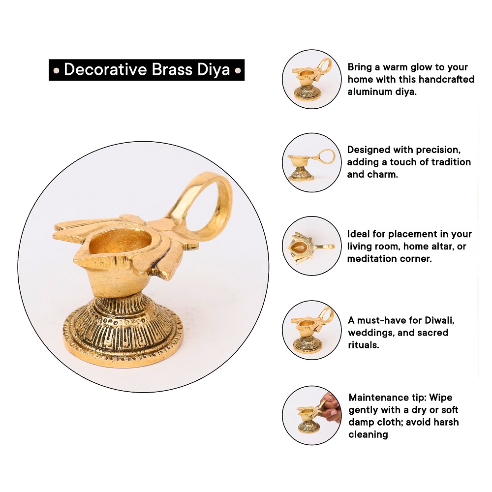 Light up your sacred spaces with the Brass Lotus Shape Oil Lamp on Stand with Handle, a handcrafted diya that beautifully combines devotion and artistry. Designed in the graceful form of a blooming lotus, this diya reflects purity and spiritual awakening. The sturdy brass stand ensures stability, while the easy-to-hold handle makes it functional and traditional at the same time. With its golden polish and intricate detailing, it’s an elegant centerpiece for daily puja rituals and festive celebrations.