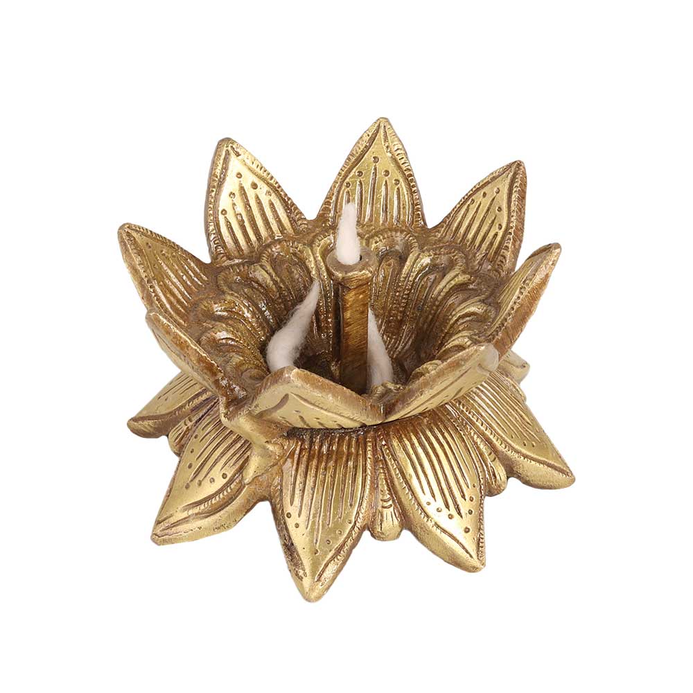 The brass oil lamp is an exquisite piece of art that is shaped like a lotus flower. This lamp is commonly used during special occasions and festivals to bring warmth and light to the festivities. The lamp is made from high-quality brass and has a shiny golden finish that adds to its elegance. It has a deep cavity to hold the oil or ghee and a cotton wick that burns brightly to emit a warm and soothing glow. The lamp is traditionally filled with mustard oil or desi ghee, which is believed to have purifying properties. It is a symbol of purity, enlightenment, and prosperity, and is often used during religious ceremonies and rituals. The brass oil lamp is a timeless classic that will add beauty and charm to any occasion. Gift this incredible oil lamp to your loved ones on special or festive occasions.