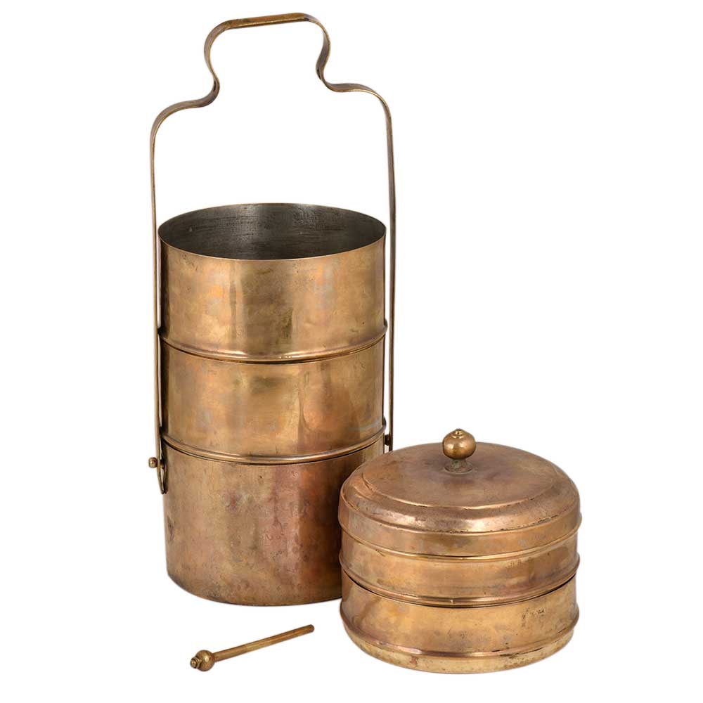 Hand crafted Brass Tiffin box with four containers and a u frame with knob finial and screw fastener . Use it as a showpiece, Table decoration, planter pot , jewelry storage and as a corporate gift during diwali, Christmas, new year and house warming etc.