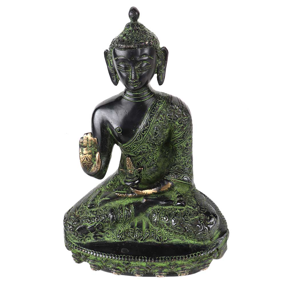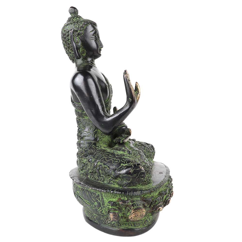 Buddha is sitting on a raised platform with eyes closed and hands in meditational position, this figurine is made of bronze and is handmade by the skilled craftsmen of India. This can be used for gifting, decoration, worshipping etc.