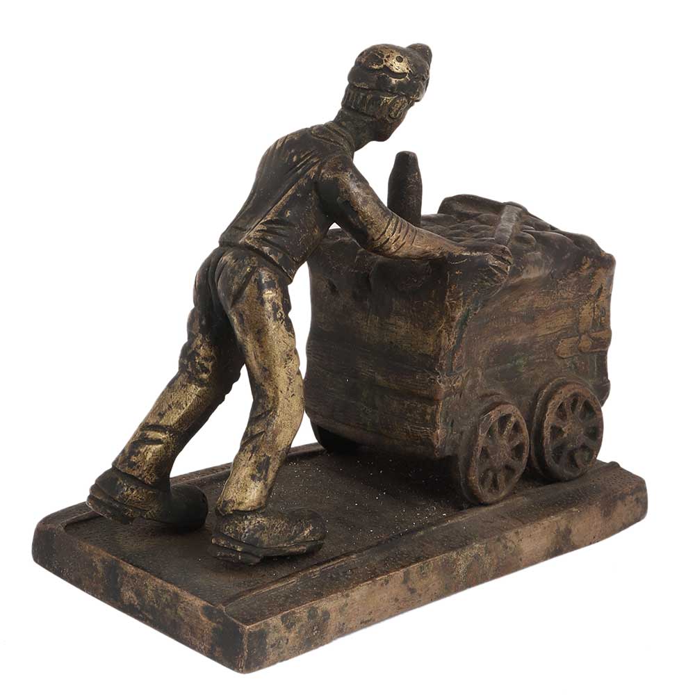Handmade Brass Miner Statue Pushing Coal On Wooden Plinth made by the local craftsmen of India. A perfect home / office / living room decor and an ideal lucky gift item for your loved ones.