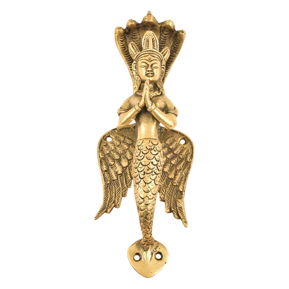 Brass door handle is shaped like flying nag kanya (snake lady). Snake lady has her wings and her crown. She has five snake heads that work as umbrella for her human head. She has her snake-nectar on top of her middle snake head. She is folding her hand palms in greeting posture.