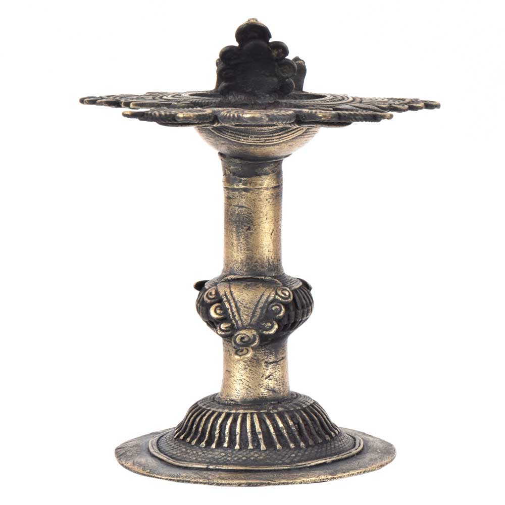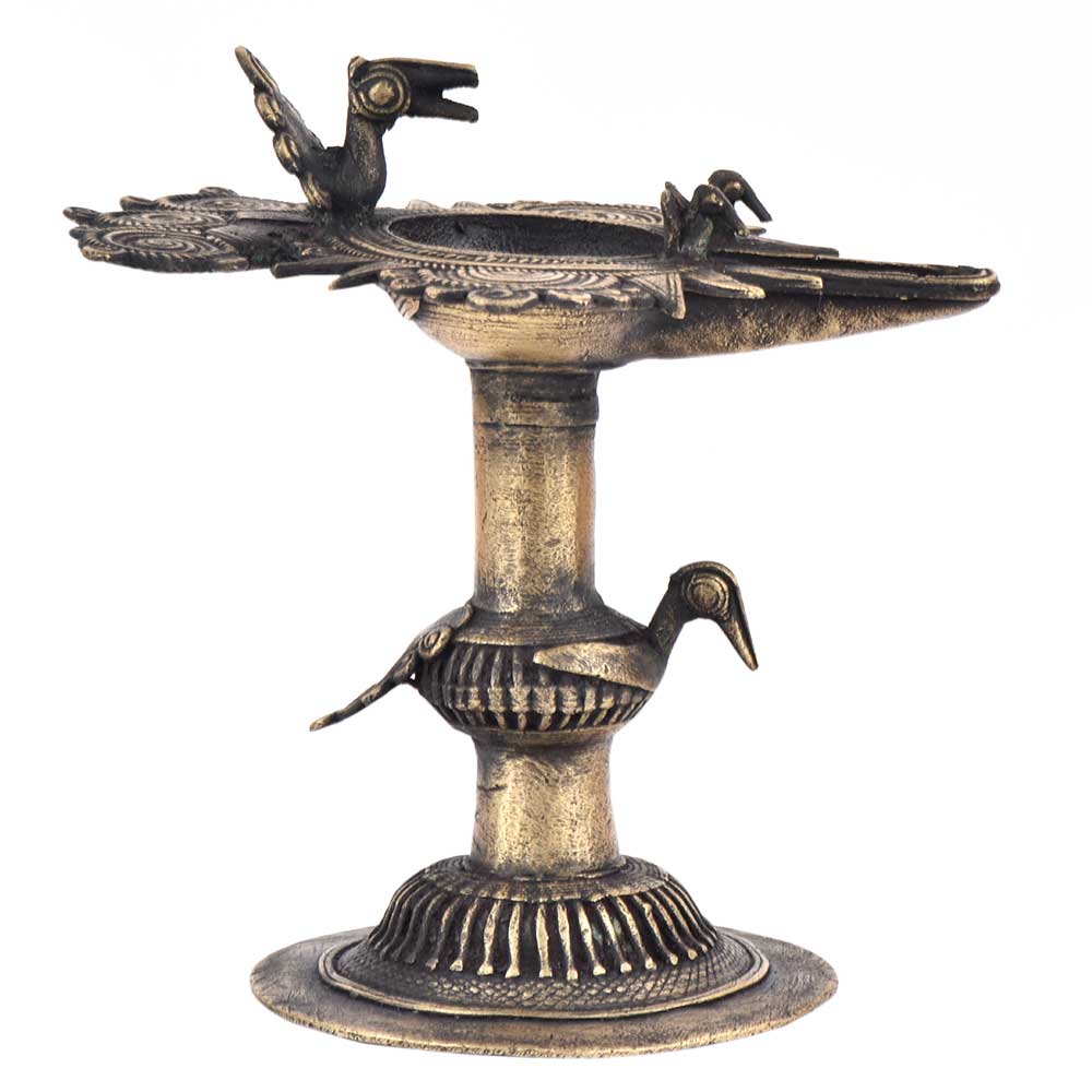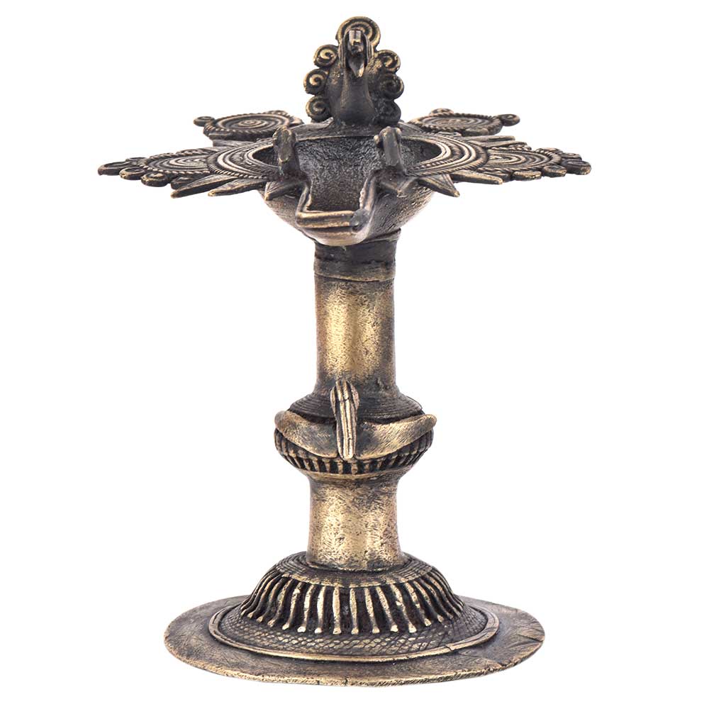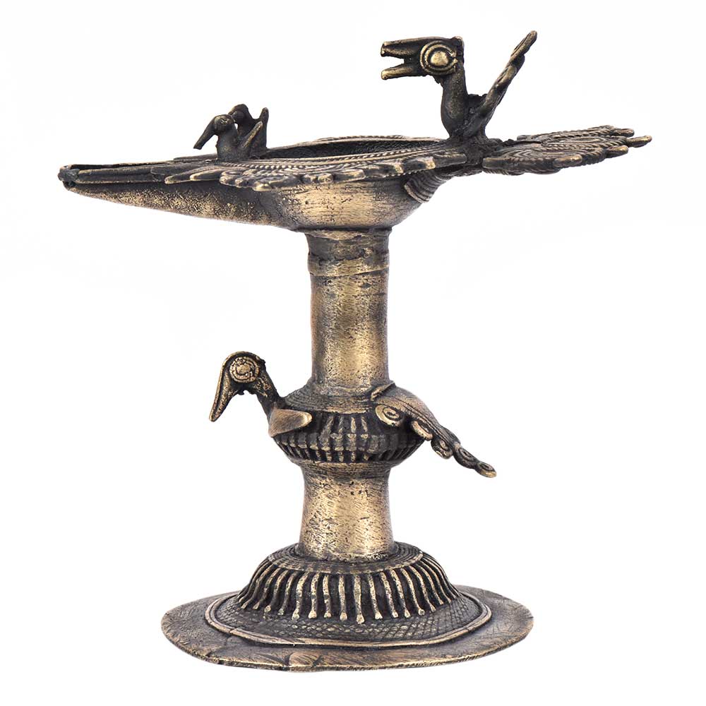Handcrafted using old lost wax technique primarily practiced in Orrisa and West Bengals by the local or tribal artisans. In this technique the molten wax is poured into desired clay mould and when the wax melts the clay is broken and we get the desired metal object which is further polished to perfection. The Deep Cup Can Be Filled with Oil and Light a Cotton Wick. Diyas/ Oil Lamps are Considered Auspicious as in Hindu Religion. It is detailed with Elephant and Peacock Animals with Beautiful Details.