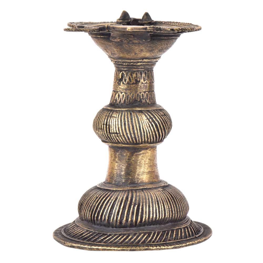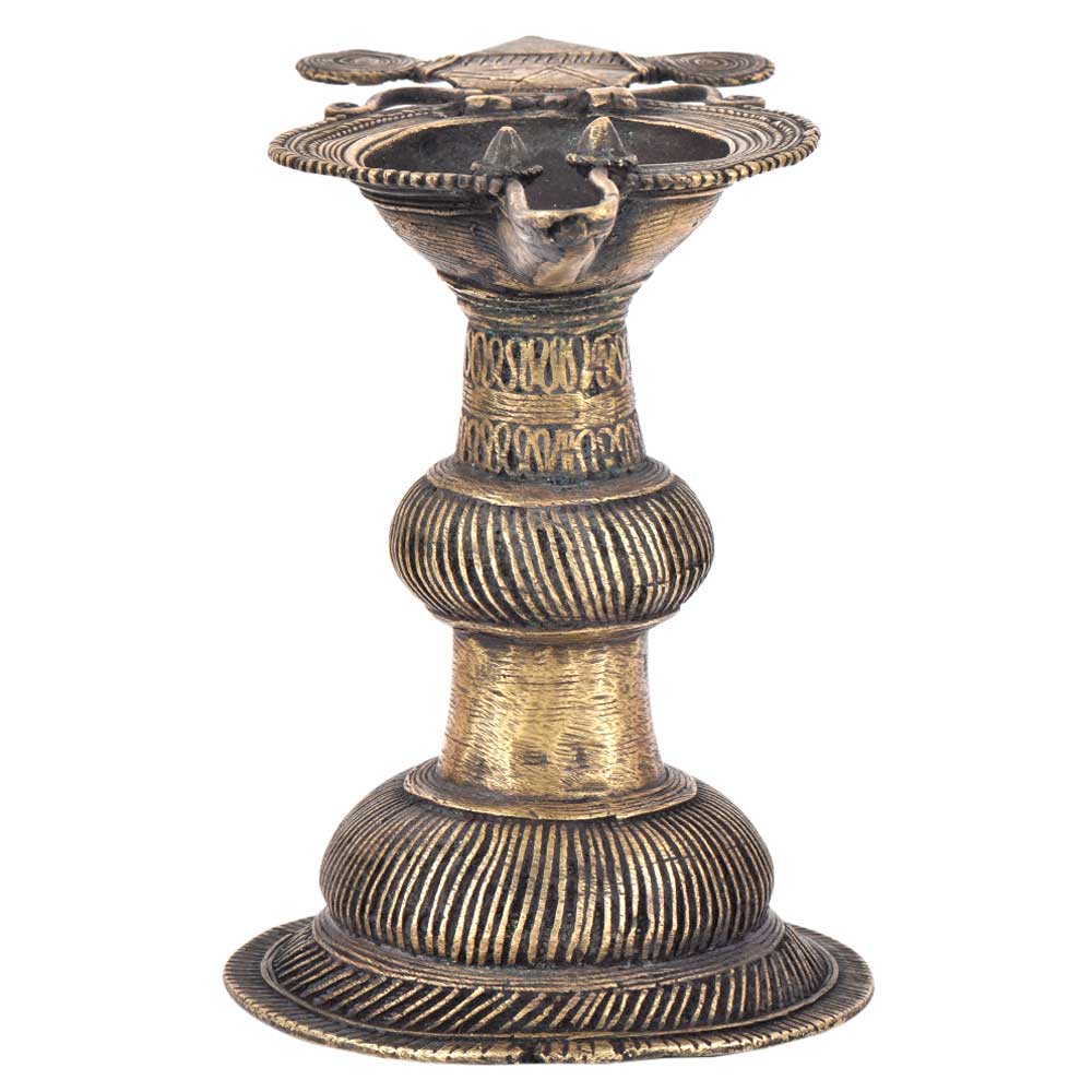 Handcrafted using old lost wax technique primarily practiced in Orrisa and West Bengals by the local or tribal artisans. In this technique the molten wax is poured into desired clay mould and when the wax melts the clay is broken and we get the desired metal object which is further polished to perfection. The Deep Cup Can Be Filled with Oil and Light a Cotton Wick. Diyas/ Oil Lamps are Considered Auspicious as in Hindu Religion. It is detailed with Elephant and Peacock Animals with Beautiful Details.