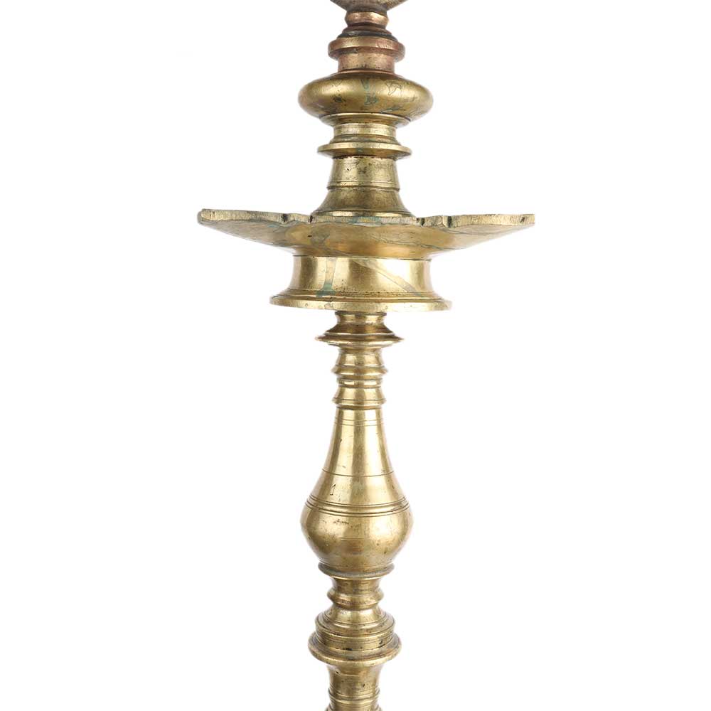 Handmade south indian brass oil lamp with a decorative finial and 4 wicks oil container with a circular base. Diwali decoration, stage decoration, inaugural event decoration, weddings, housewarming ceremonies and other auspicious events. Gift for near and dear ones.