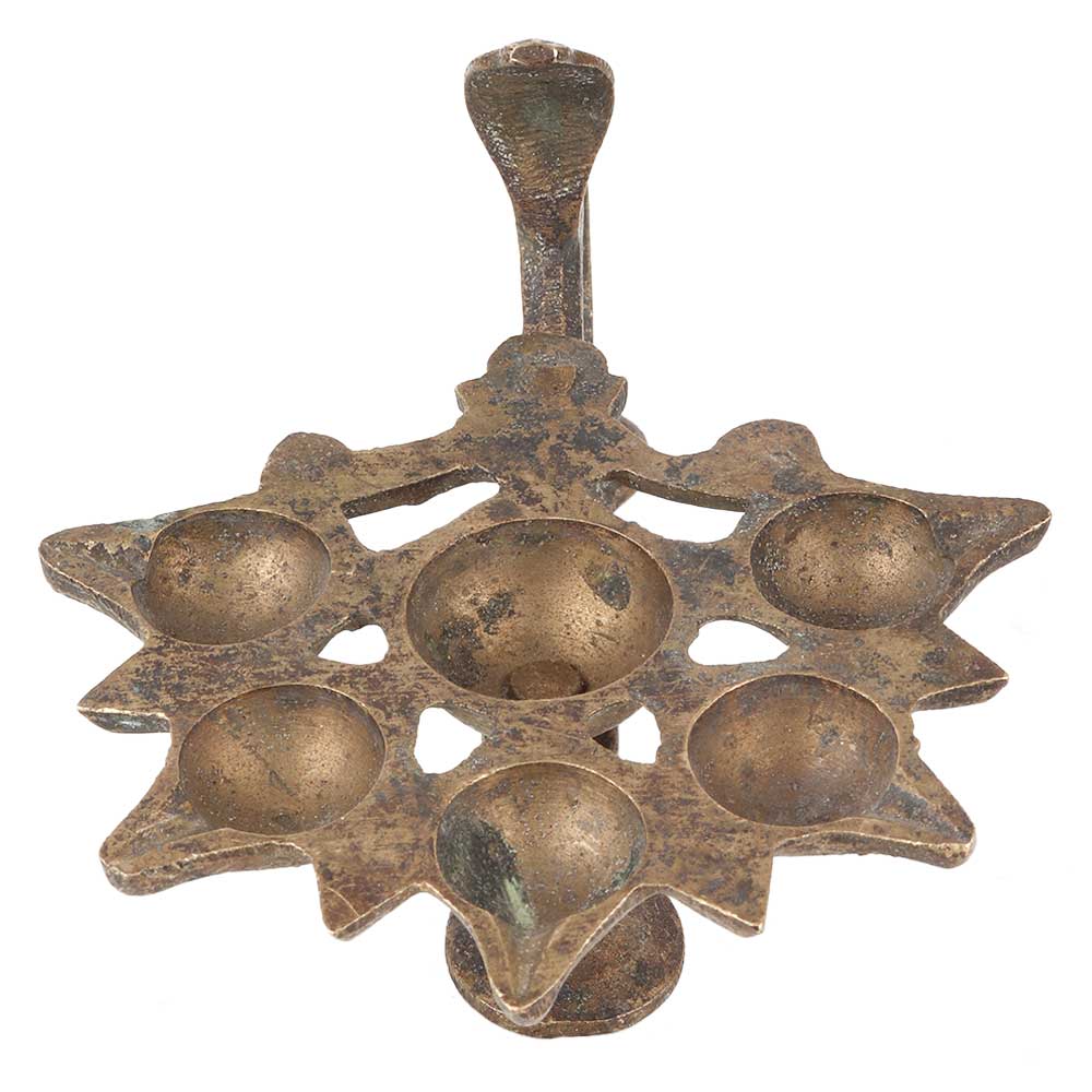 Handcrafted brass oil lamp made by the expert craftsmen of tribal India shows a oil lamp with six wicks and snake head and a handle to hold the lamp. This lamp is often used in religious places and in the puja room or worship room . Ideal gift for relatives and friends.
