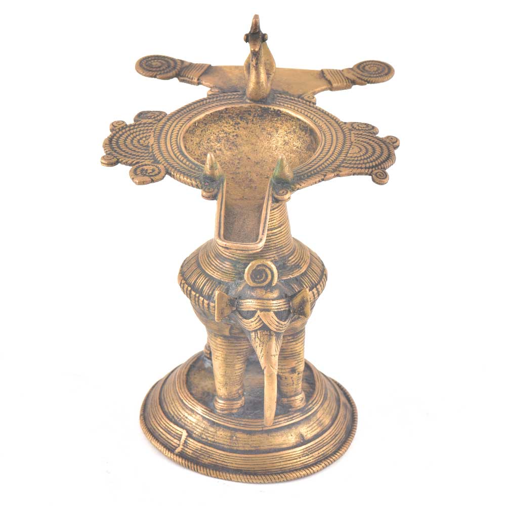 This is a very rare looking brass oil lamp which has a deep cup to fill the oil with a stand that has an elephant statue . The best feature is that it also has a beautiful peacock bird on top. This lamp is often lit on auspicious occcasions like diwali and also used as a gift for friends and relatives.