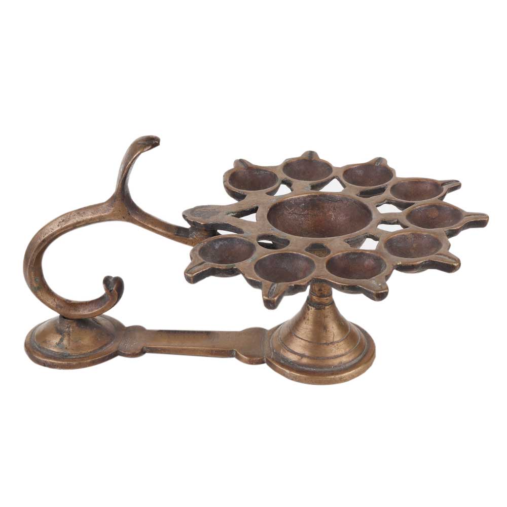 Handcrafted brass oil lamp made by the expert craftsmen of tribal India shows a oil lamp with eight wicks and snake head and a handle to hold the lamp. This lamp is often used in religious places and in the puja room or worship room . Ideal gift for relatives and friends.