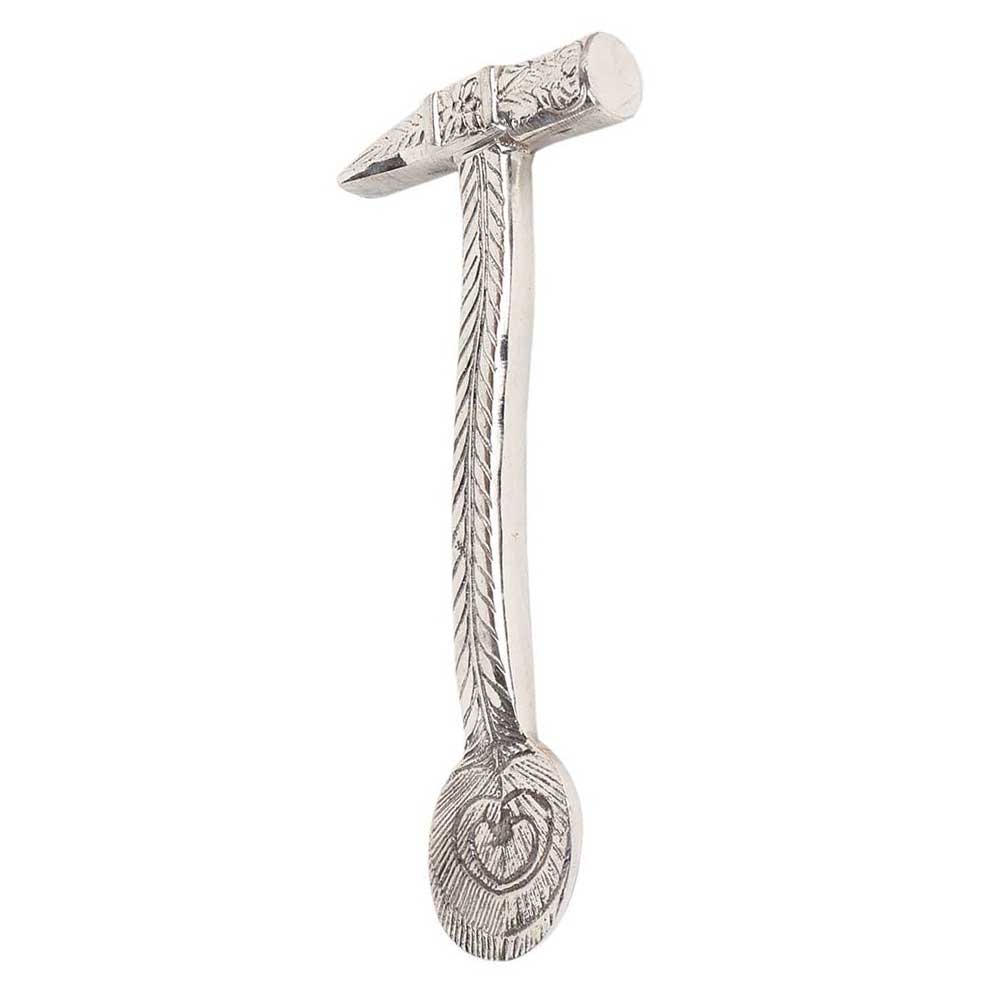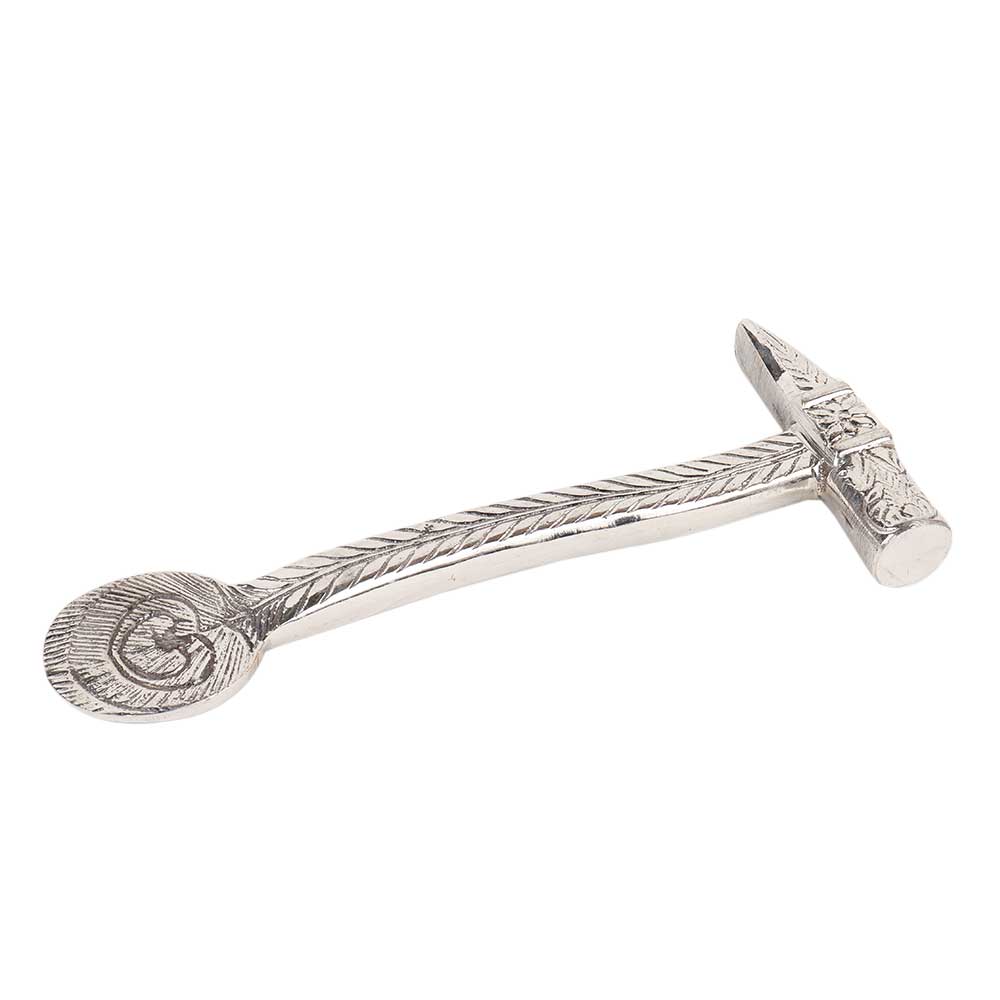 Brass paperweight with a long carved design with a bulb shaped base and hammer on top is made the local artisans of India . It serves as an ideal study table decoration, diwali gift, birthday gift , anniversary gift for your near and dear ones . It comes with a lovely nickel plating.