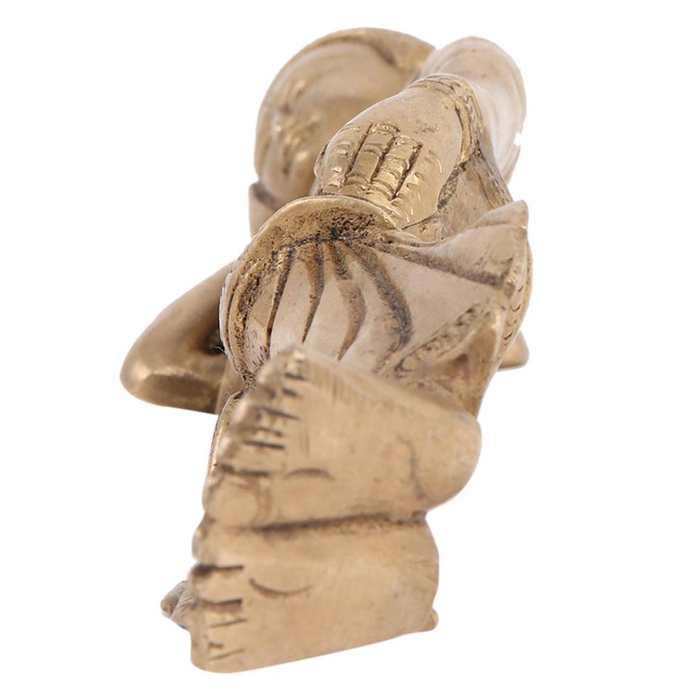 The handmade Buddha's Parinirvana statue was both a final victory and a tragic event because it marked the Buddha's release from the reincarnation cycle. This brass Buddha statue depicts the Parinirvana in a highly simplified, almost emblematic manner. The awakened one, reclining on a rectangular base with turned or carved legs, fills the foreground with his halo headrest on his right hand and his robe covering his left hand.