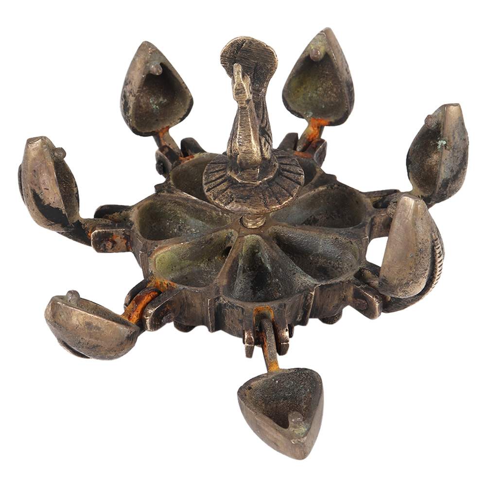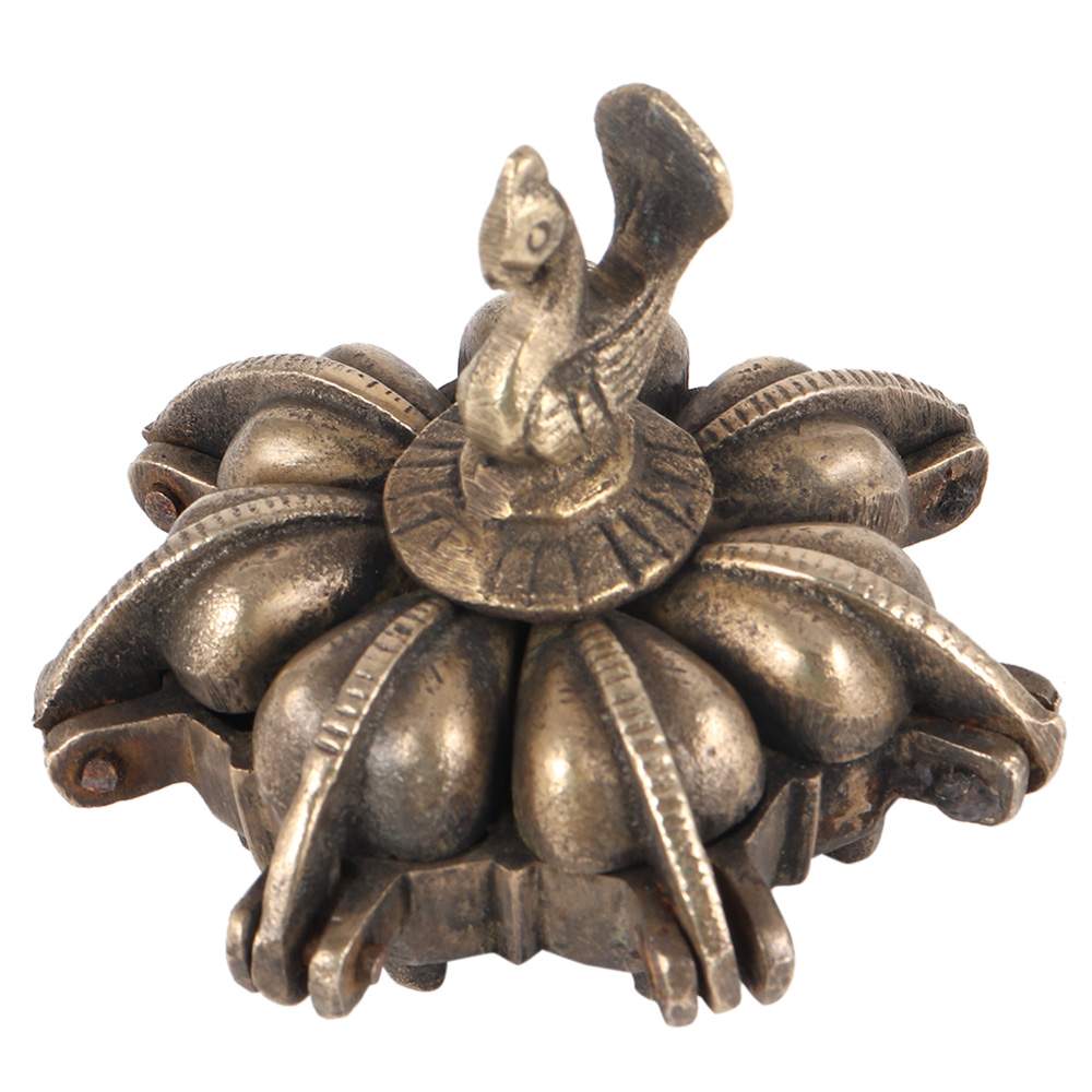 This lovely multi-compartment brass kumkum or sindoor vermilion box will complement your pooja decorations. This item, with elaborate features and many slots, can let you attend to your puja demands. This badam-shaped piece also makes an excellent gift. This elegant kumkum or sindoor vermilion box is made of durable brass for long-lasting use. This one-of-a-kind accent item adds a touch of refinement to your decor.
