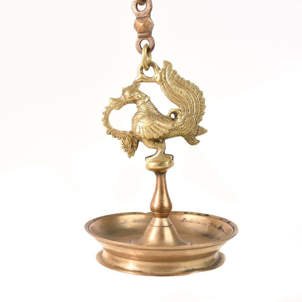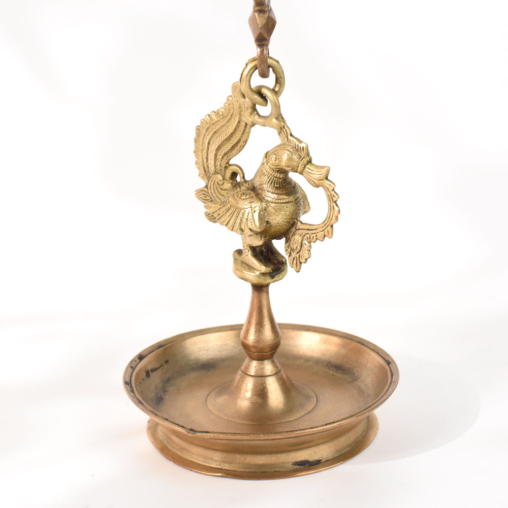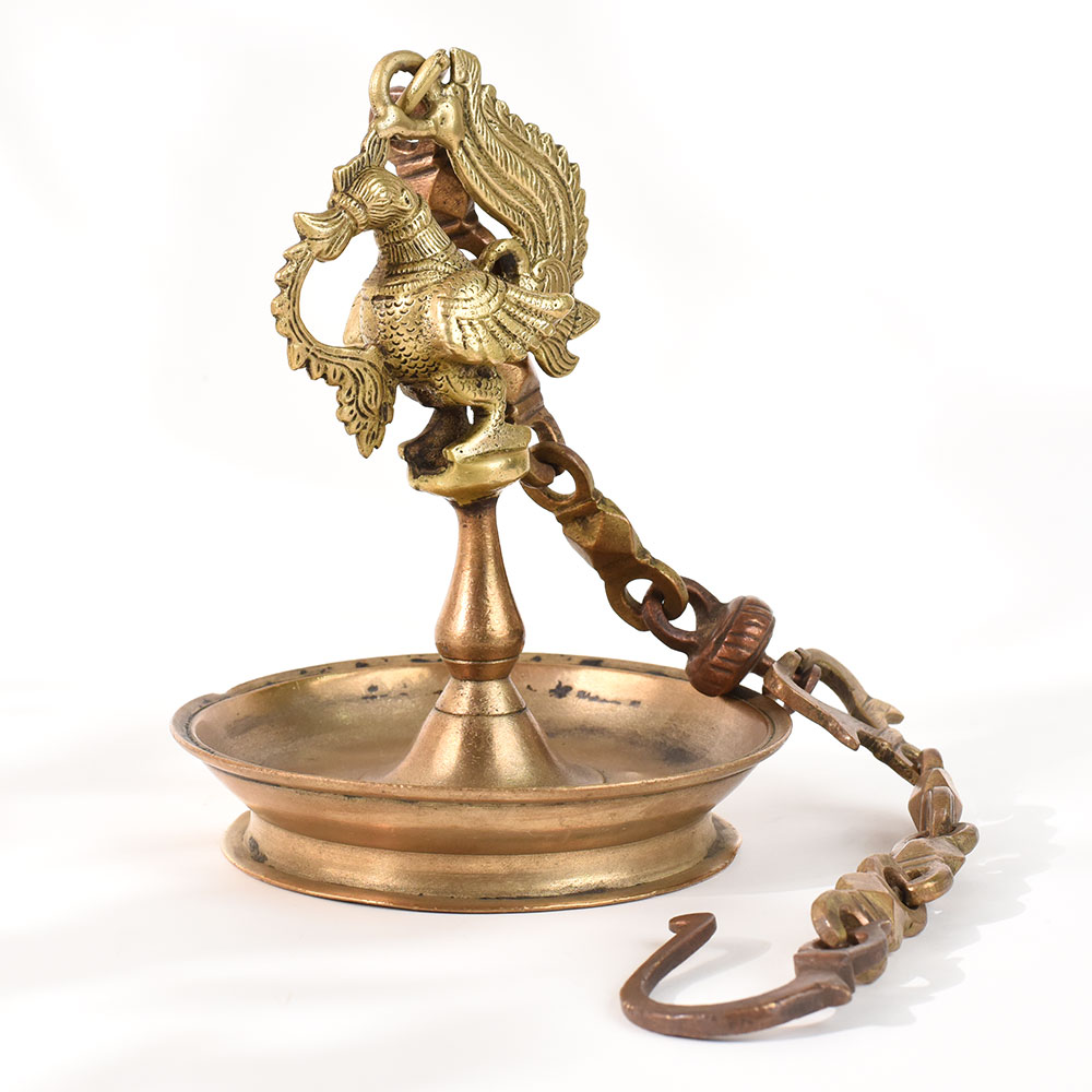 Brass Made of high-quality brass, diya hanging. Peacock and diya plate created a beautiful design for it. Oil lamps are used with a diya plate. Since ancient times, this brass hanging has been used to adorn homes and temples. It can be used for pooja and festivals.