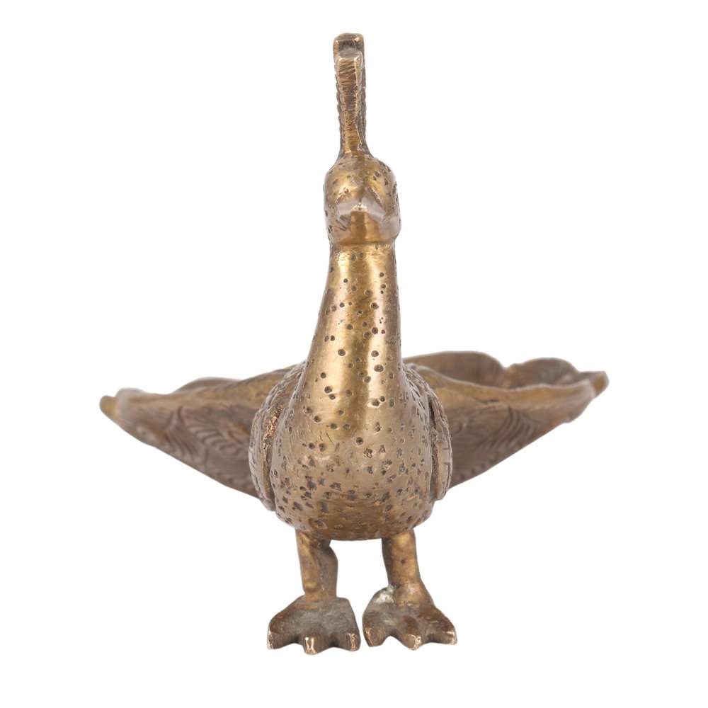 Brass Peacock feathers cascade into a fluffy fan to capture all of your treasures. This one-of-a-kind tray combines 70's glitz with current materials used to create a timeless addition to your foyer, bedside table, or washroom countertop. It comes with an antique golden finish.