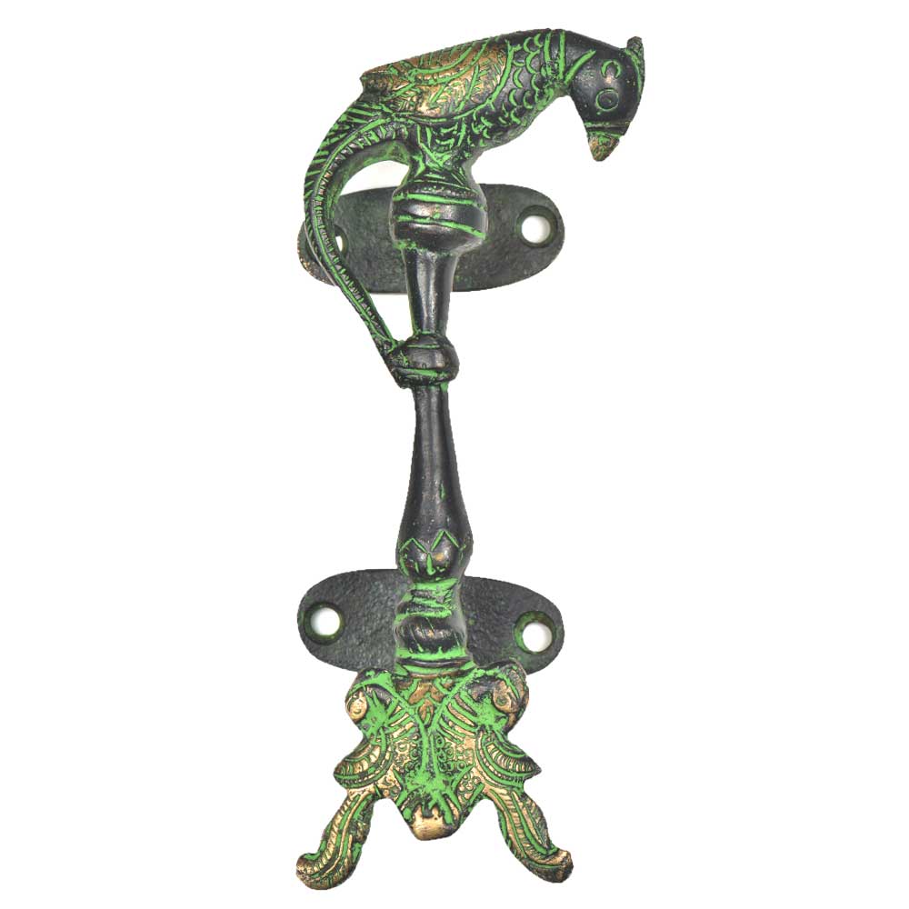 An intricately carved patina rich brass door handle beautiful handmade door handle In pair for the front door of your house is not only decorative but also very functional . It has two peacocks engraved on the handle and a parrot on top with a simple design at the center to give a proper grip to the handle