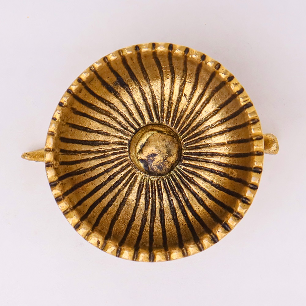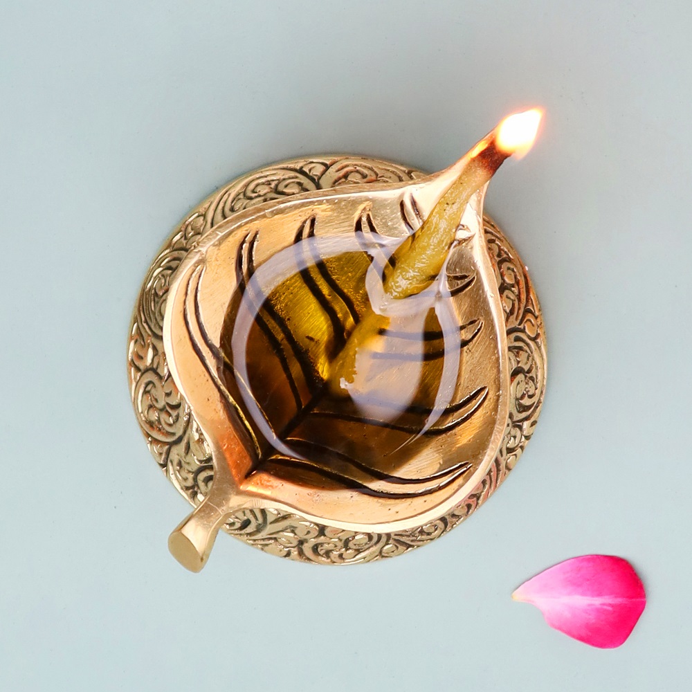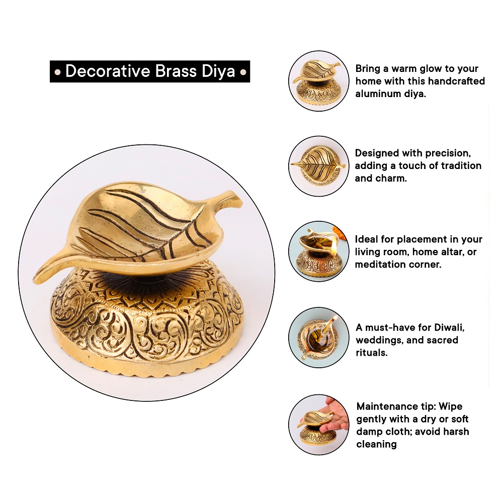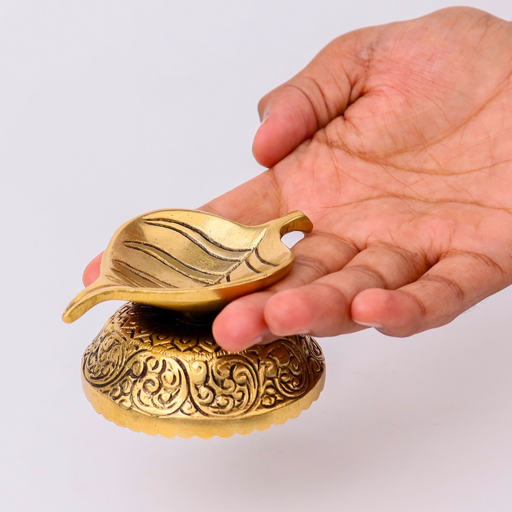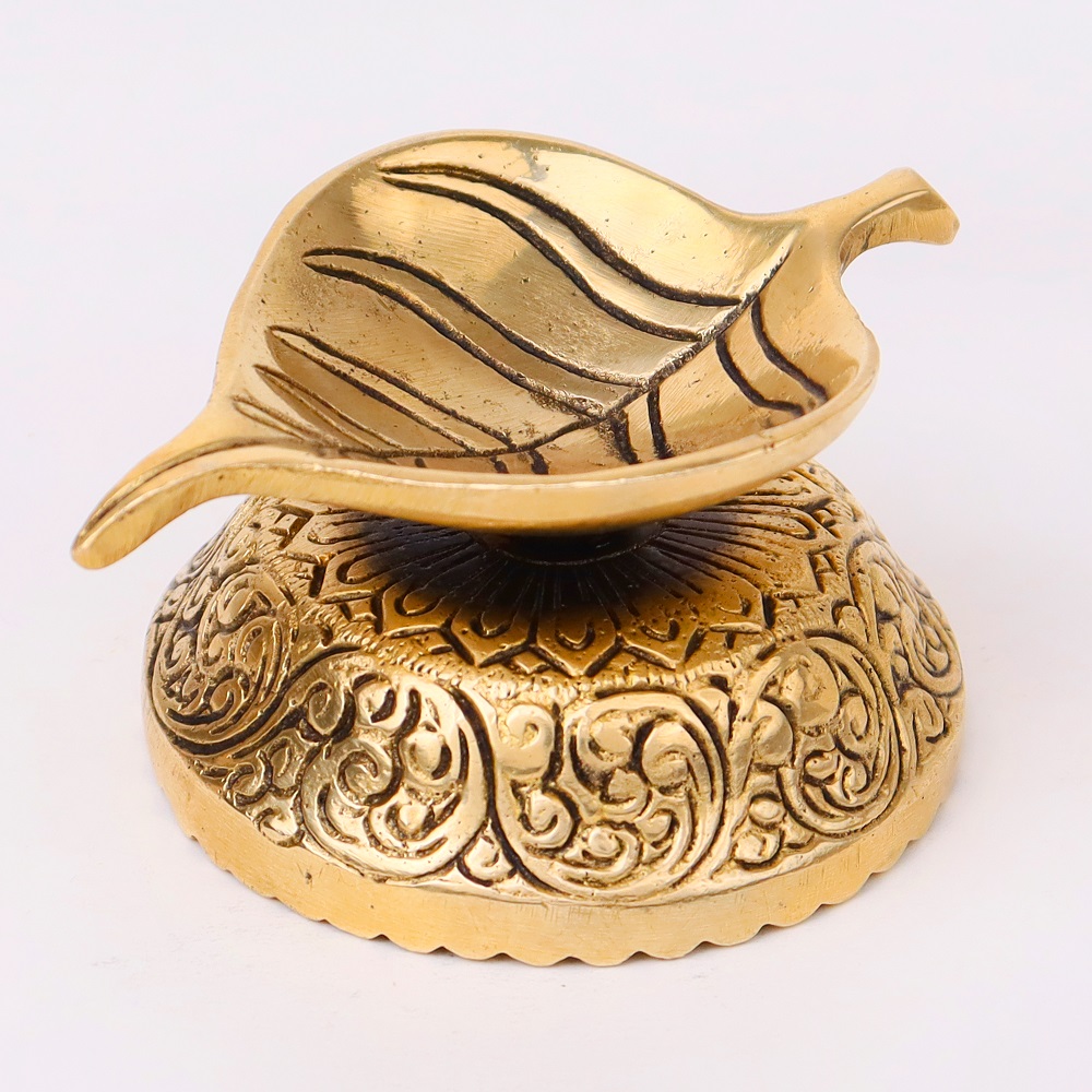 Illuminate your rituals with the Brass Peepal Leaf Oil Lamp Diya on Decorative Base, a piece that blends tradition, artistry, and symbolism. Shaped like the revered peepal leaf, this diya symbolizes enlightenment, wisdom, and divine blessings. Crafted from solid brass with a golden polish, it rests on a decorative base that adds elegance and stability, making it ideal for mandir décor, Diwali celebrations, and auspicious gifting.