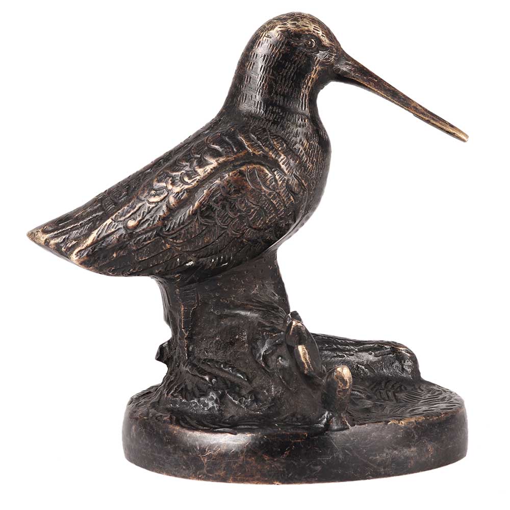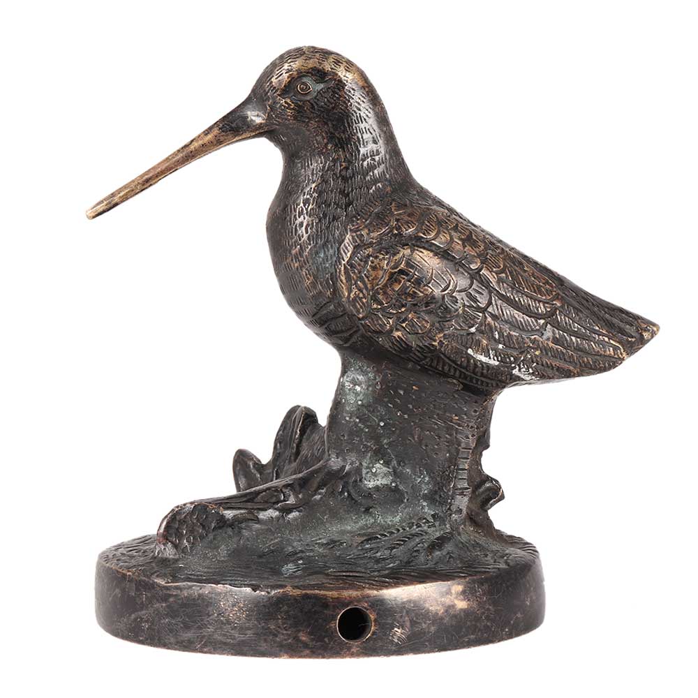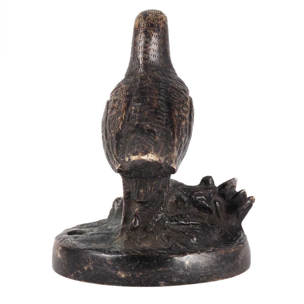 A vintage brass sculpture of a bird gently placed on something like a log. The legs, feathers, eyes, and tree trunk of the figurine are all detailed. This figurine has wear from aging, but it gives charm to the piece. It make an excellent accent to any old brass home decor.