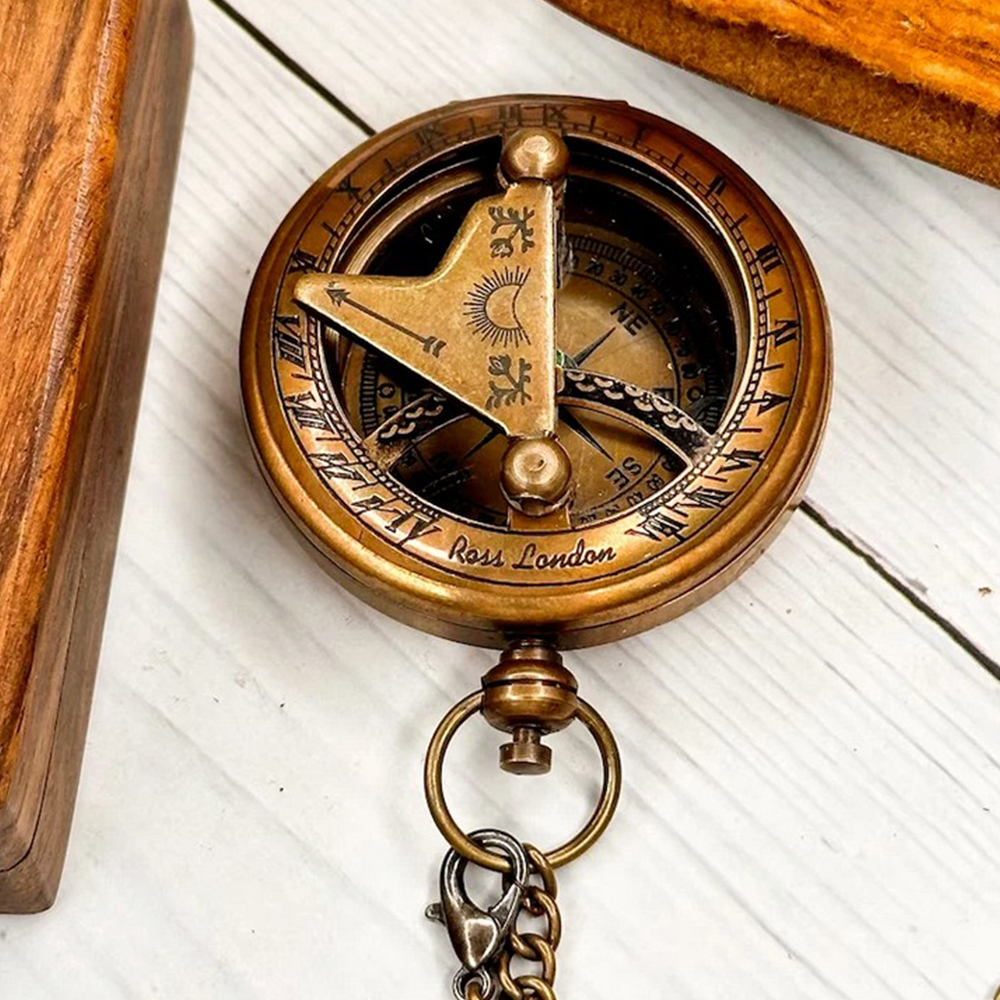 Wipe the brass surface gently with a soft, dry cloth. Avoid moisture and abrasive cleaners. Store the compass inside the wooden box when not in use.