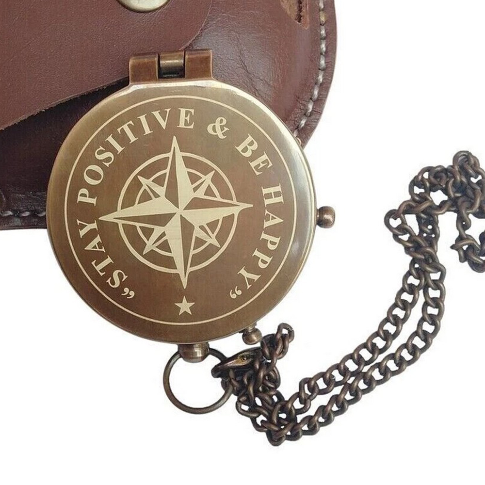 Add symbolic meaning and navigation heritage to your collection with this brass pocket compass with leather case and engraved quote lid. Crafted from solid brass and housed in a fitted leather sleeve, this compass combines traditional navigation design with inspirational detailing. The engraved message inside the hinged lid adds a thoughtful dimension, making this piece both a functional artifact and a meaningful keepsake.