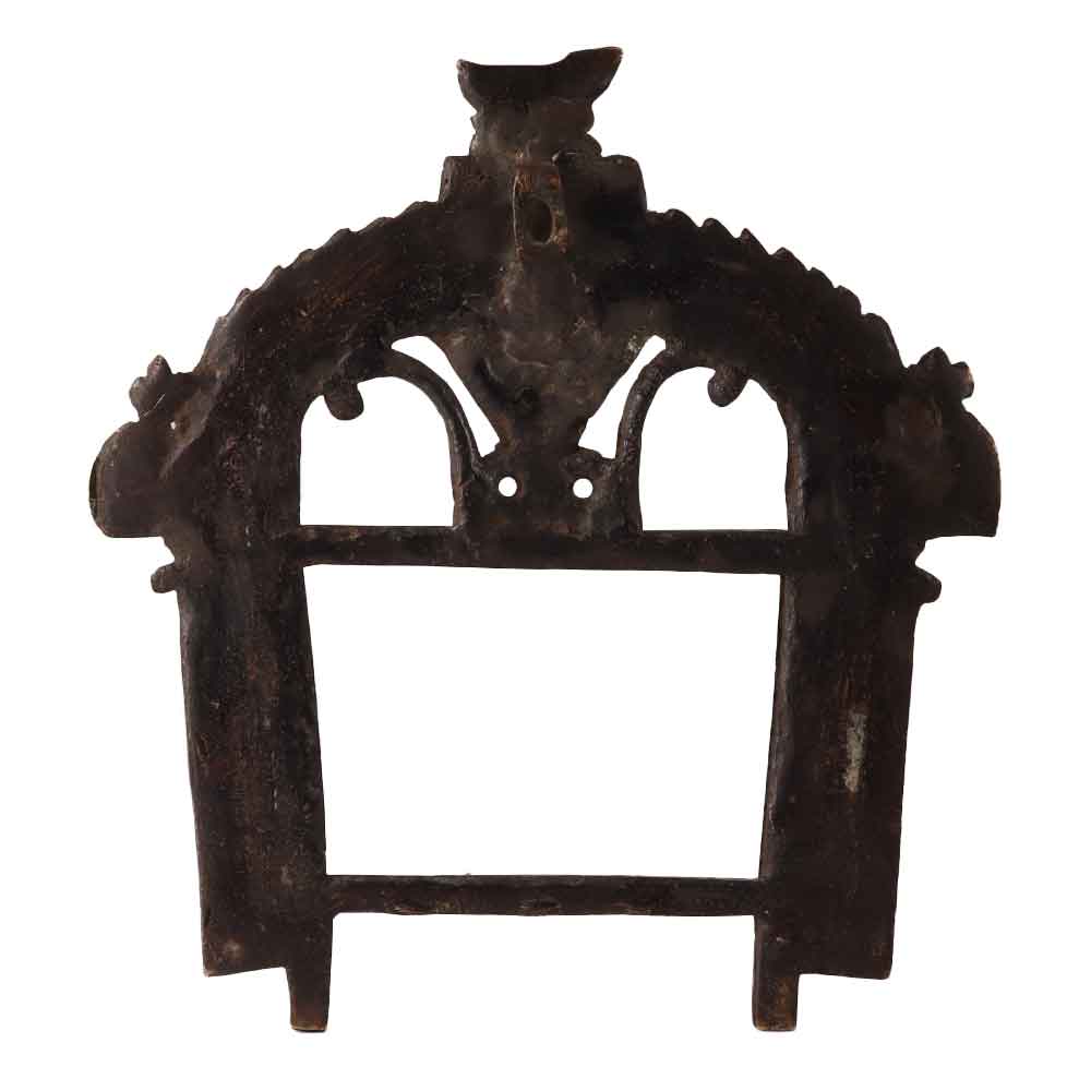A brass prabhavali or prabhawal frame for god or decoration in the house. This prabhavali is handmade from high quality brass in South Indian art using ancient methods. It is engraved with beautiful motifs and a snake with seven heads. This prabhawal can be used in prayer rooms or temples and for decoration at home, office, restaurant, hotel or cafe and as a vintage collection. A fascinating find for vintage art lovers to add to their collection. Its unconventional design sets it apart from other brass Prabhavali and an ideal gift for auspicious occasion to your loved ones.