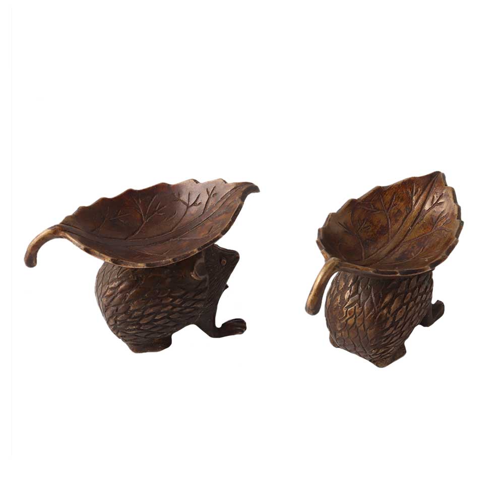 A pair of old Brass oil lamps in the shape of a leaf placed above a brass Rat in brown patina finsh. The pure brass diya is artistically carved with exquisite features. The represents longevity, protection, help, money, and prosperity. This will create attractive décor and a serene ambiance, and it will bring harmony, long life, and riches to your home, according to Vastu Shastra. The high quality of the material protects the product from easy breaking. A brass Rat also represents good luck, so it may be a unique and considerate gift that your loved ones will love.