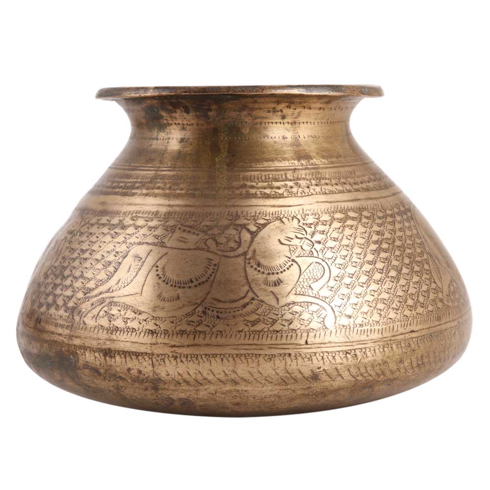 This old rare and traditional brass water pot is the ideal gift for your friends and family. This brass water pot has very Indian carved Elephant motifs and a zig-zag pattern design. This handmade water storage pot looks very Indian and traditional. Made by expert Indian artisans it is an ideal home décor and gifting option for people who enjoy collecting vintage items. It can also be used for spiritual or decorative purposes in the home and in temples.