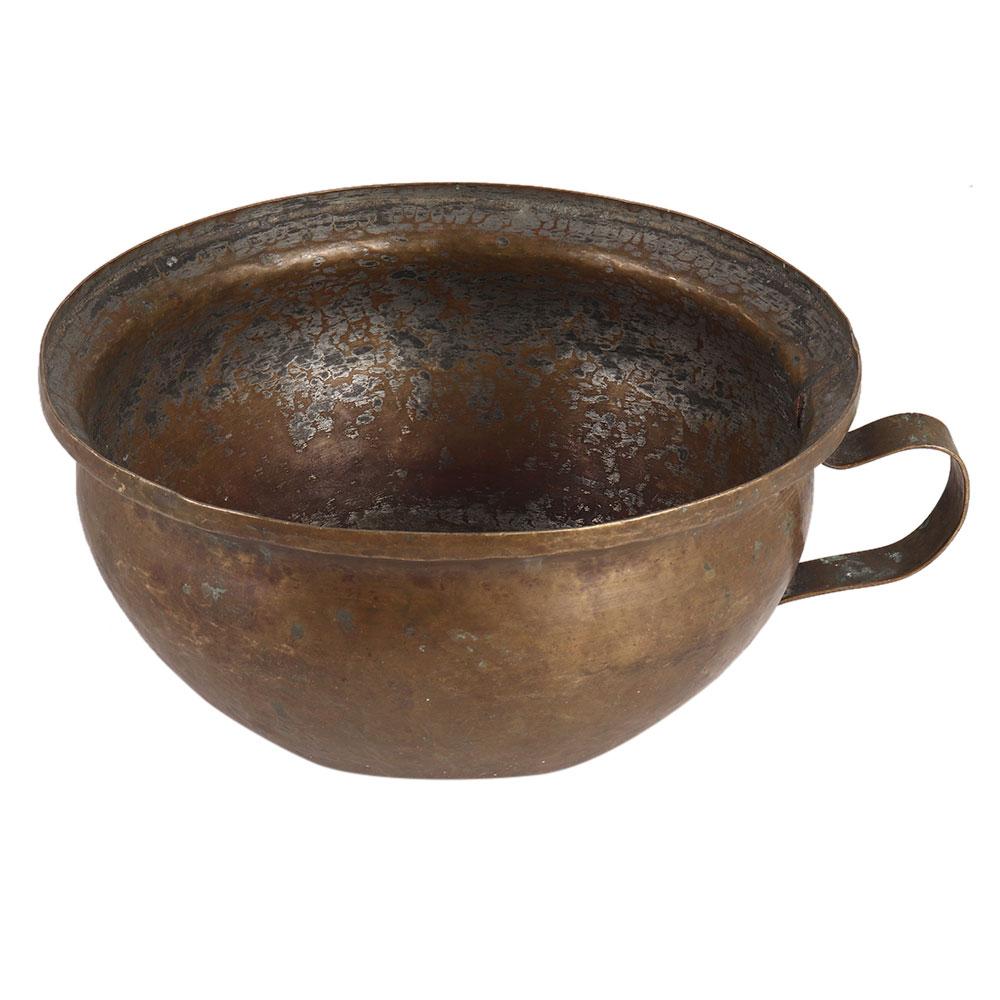 Absolutely stunning ancient brass pot with a one-of-a-kind shape and great handle. Ideal for adding warmth to your home or business! This pot will look great with some dry sticks or coal next to the fireplace or as a rustic decoration in the yard.