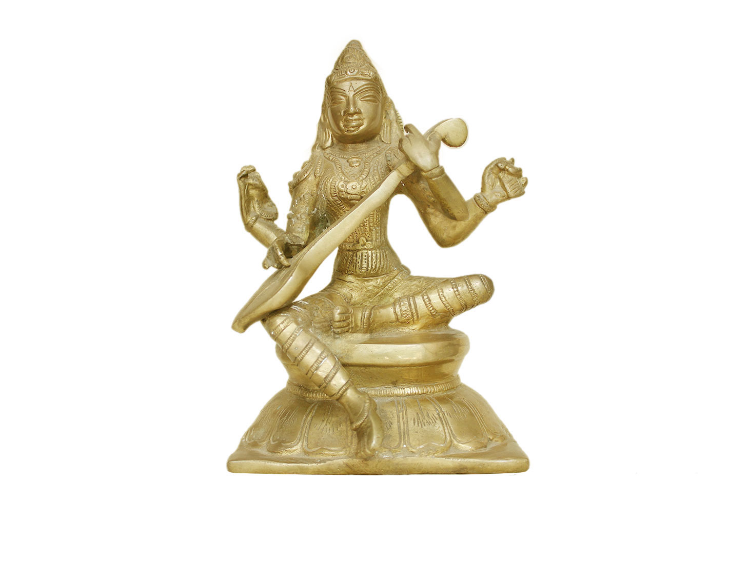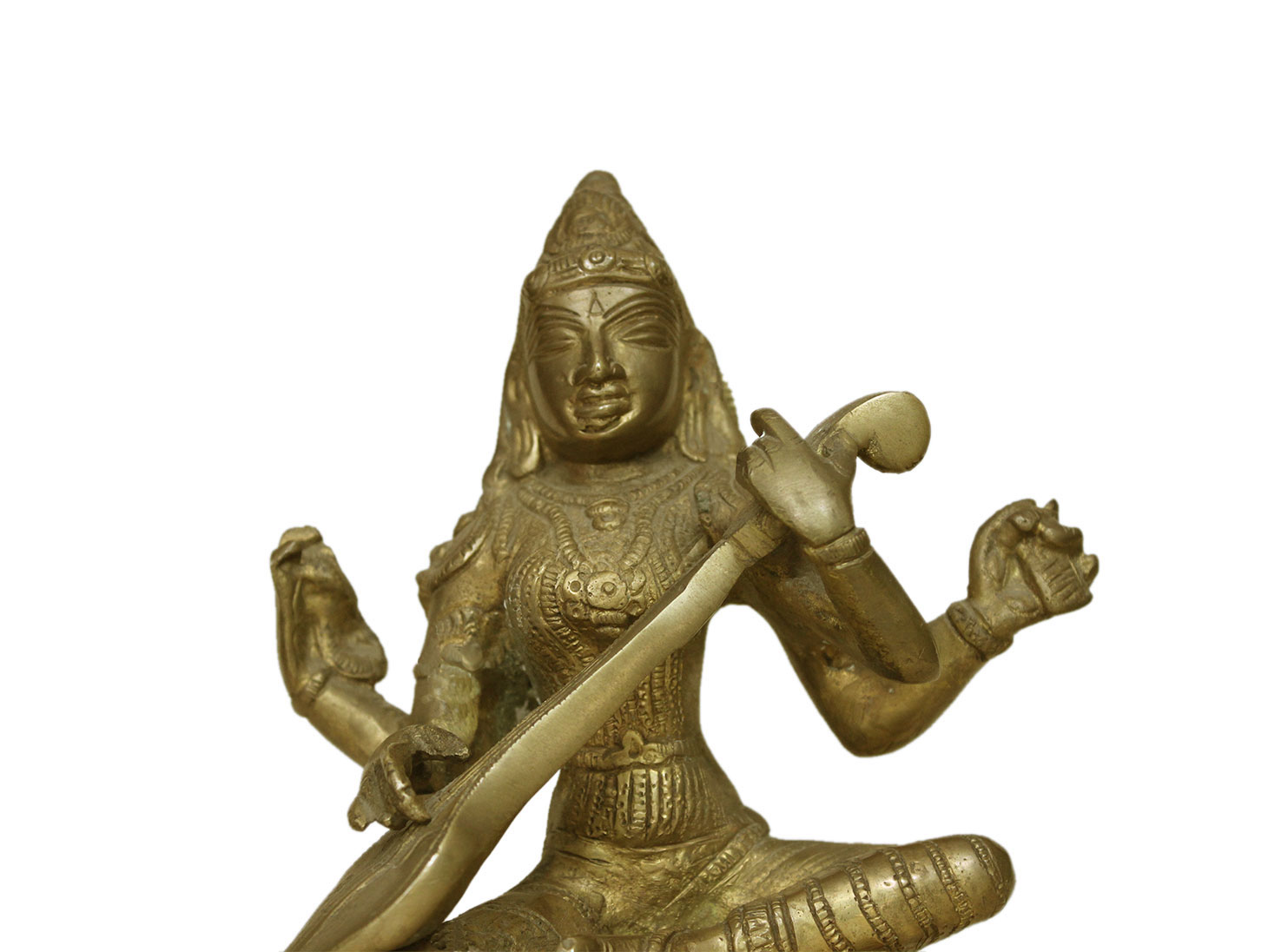 . Brass Saraswati. Finely Done to Get That Peaceful Expression on the Face. Brings Instant Peace At a Moment Glance. Fills the Atmosphere with Peace and Positive Energy. Handmade. It is More Than a Statement Piece.