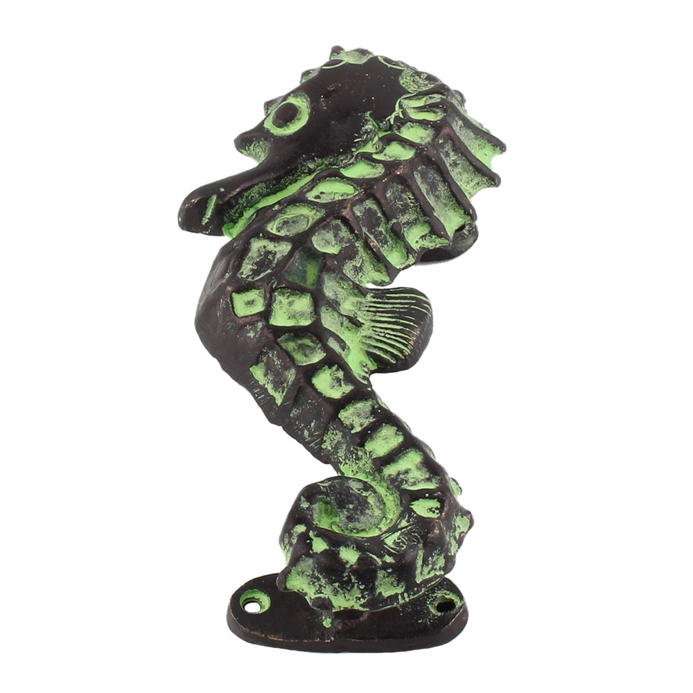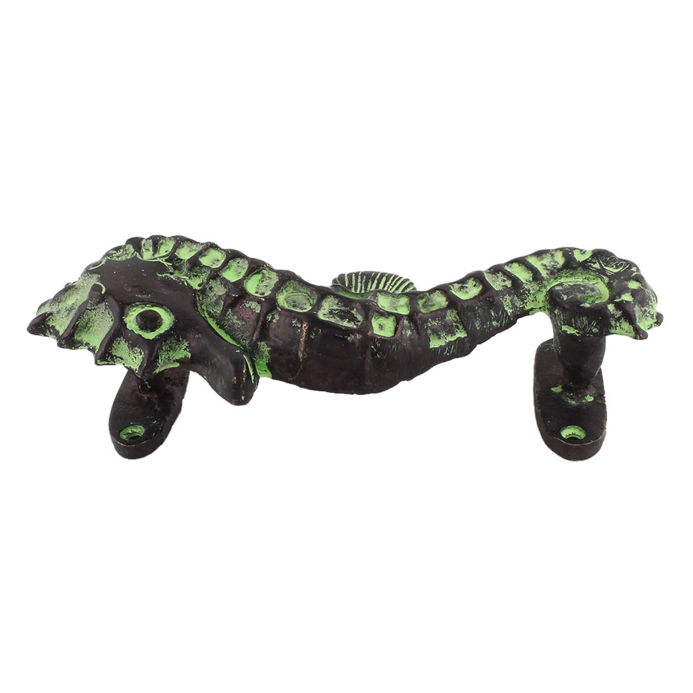 Use the handcrafted sea horse brass door handle to add style to modest home accents. An exquisite sea horse graces this brass door handle. This handle has an old finish and a good grip for opening the door. Make this simple addition to your home decor and you will receive compliments. It has a dark green patina finish.