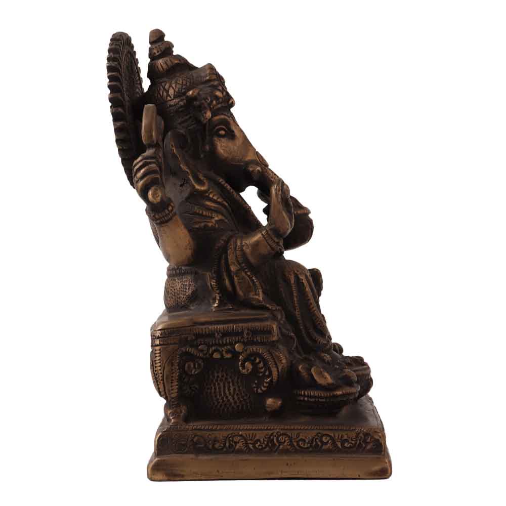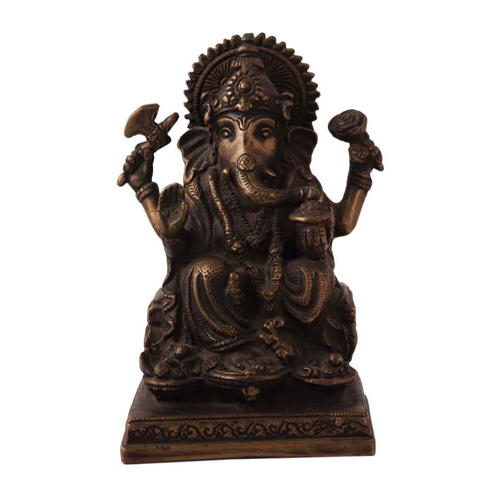 An antique brass statue of Lord Ganesha or Ganapati for home and office decoration. This statue depicts the seated Lord Ganesha on a throne with four arms. Lord Ganesha is one of the most important deities worshipped in Hinduism, son of Lord Shiva and Goddess Parvati. Place this statue in your prayer room to create an ethnic flair and spread positive energy in the house. Keeping the statue of Lord Ganesha spreads positive energy in the house and brings wealth, prosperity and happiness in your life. An ideal gift for any special and festive occasion for your family, friends and relatives.