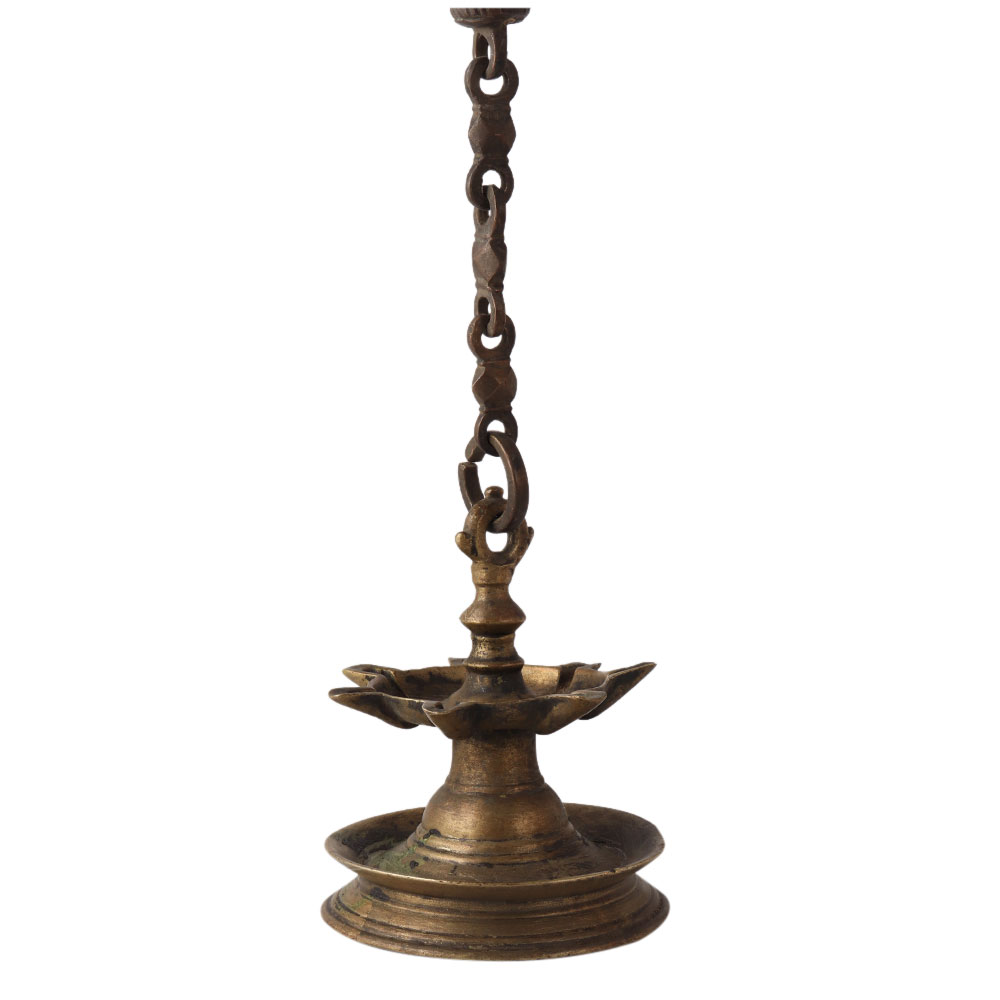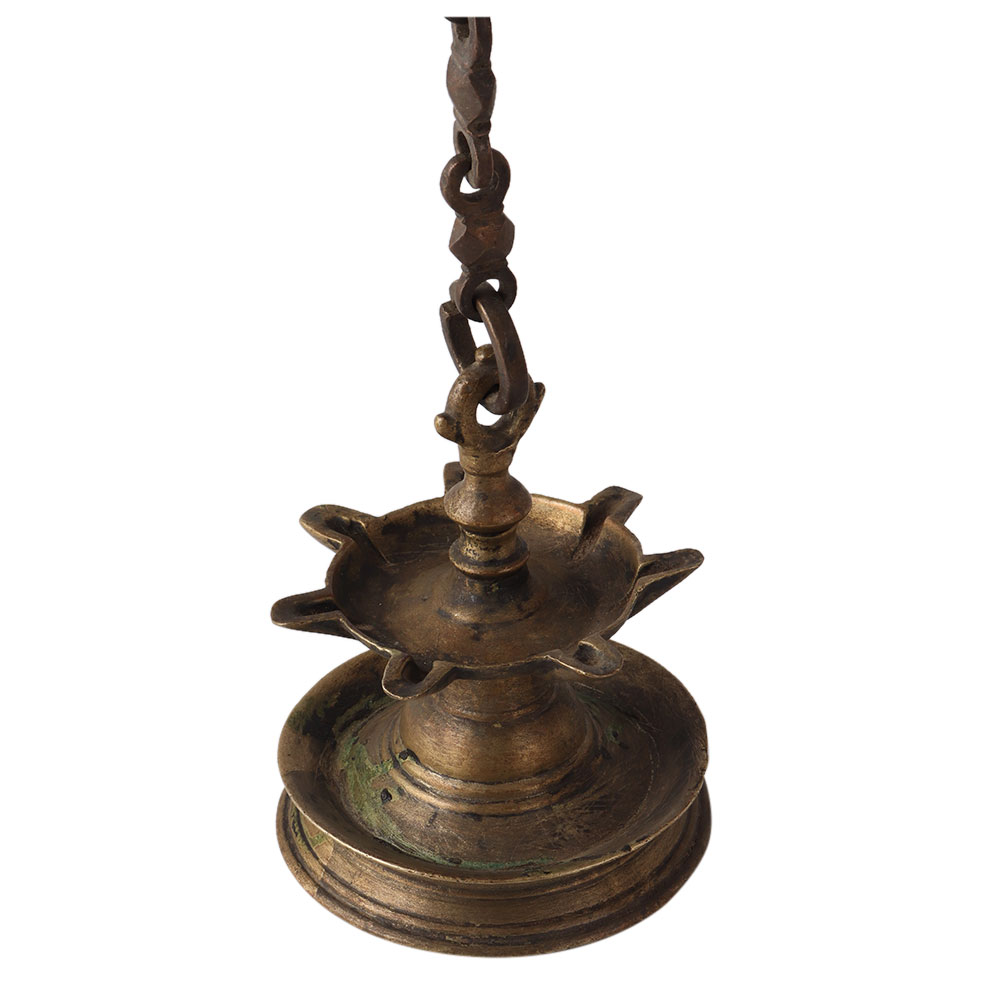 Old Indian hanging Diya lamp made of heavy brass and seven wicks. This handcrafted art ipece will give your Pooja room decor a beautiful vintage look. It will give your home's Temple Pooja room decor an elegant look. A delight for collectors of vintage art. A wonderful Item to use and Ddisplay! A lovely decorative object in a collectible shape.