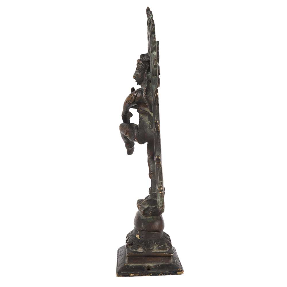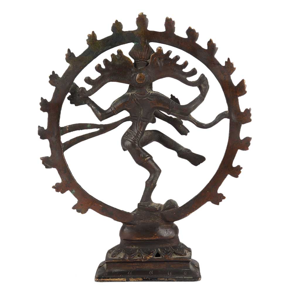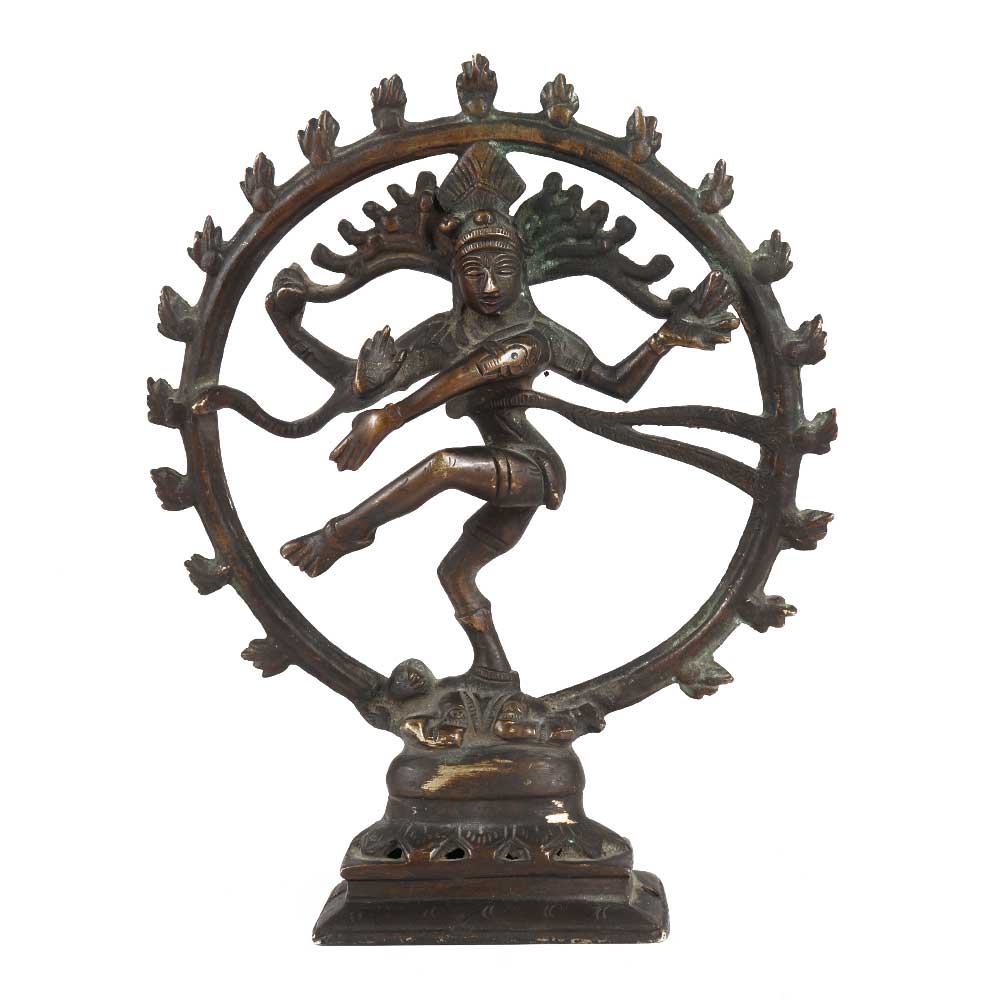 This handcrafted brass Natraja represents Shiva dancing in one of the Natya Shastra positions, carrying Agni or fire in his left back palm and gajahasta or dandahasta mudra in his front hand. The swirling hair, which spreads out in thin strands as a fan behind his head, represents the energy of the intense dance. The Lord Shiva dancing is known as the tandavam.
