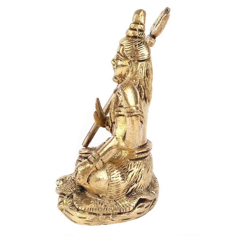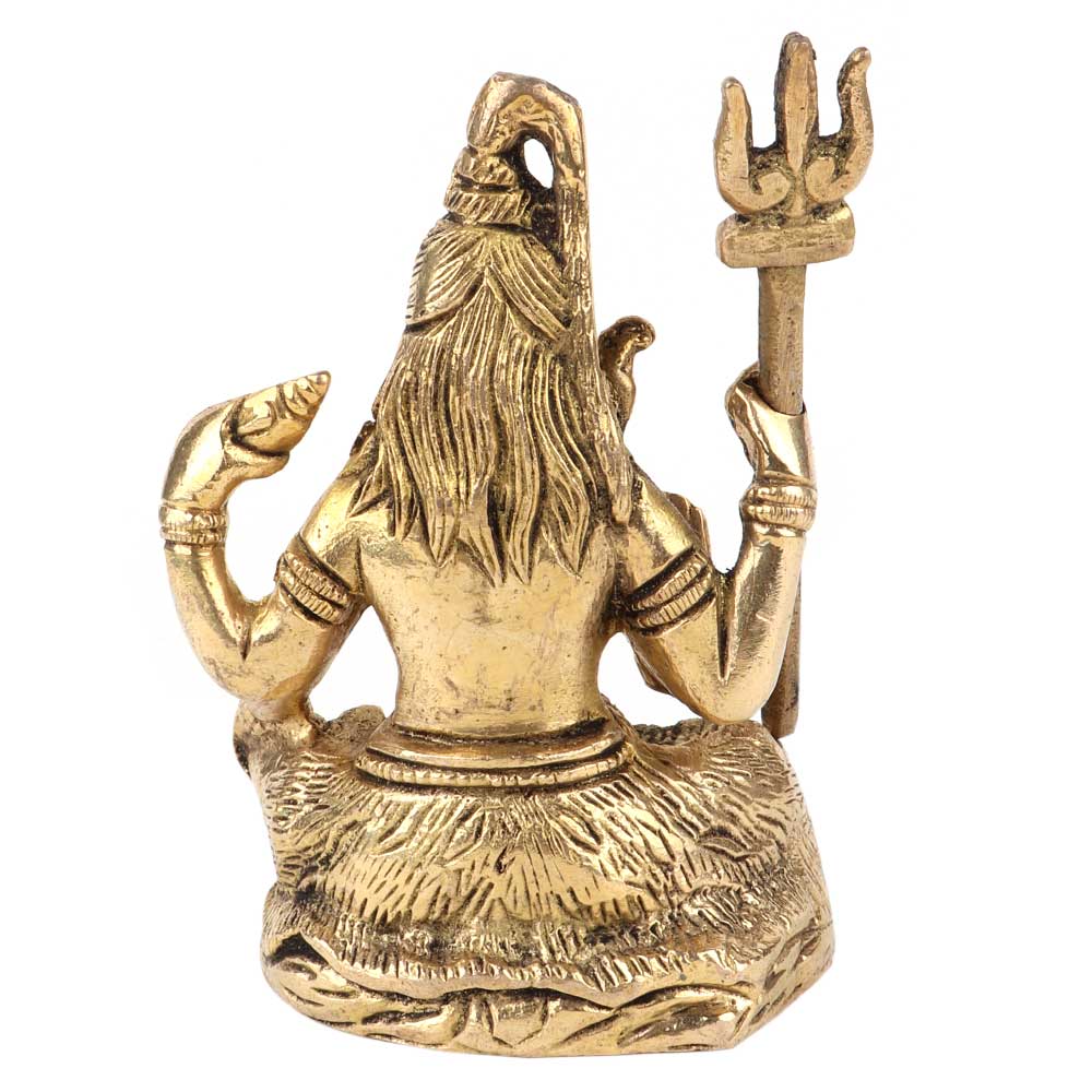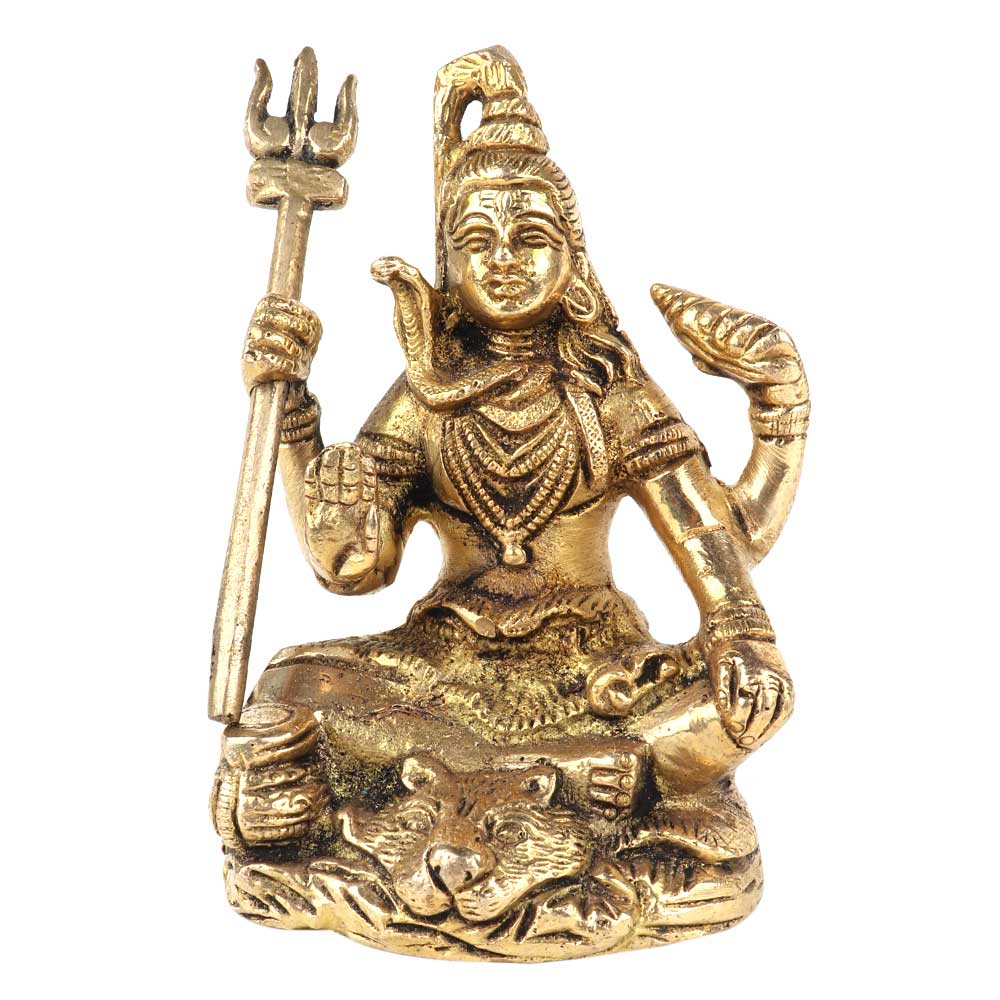 This is a brass Statue Of Lord Shiva third of the lord trinity and known as Shiva ( the destroyer). He is seen with eyes closed in meditation offering blessing from one hand and the other resting on his knee. The trident is placed behind his back and river ganga is seen coming out of lord shiva's hair with cobra resting around his neck. A useful home decor and gifting statue.