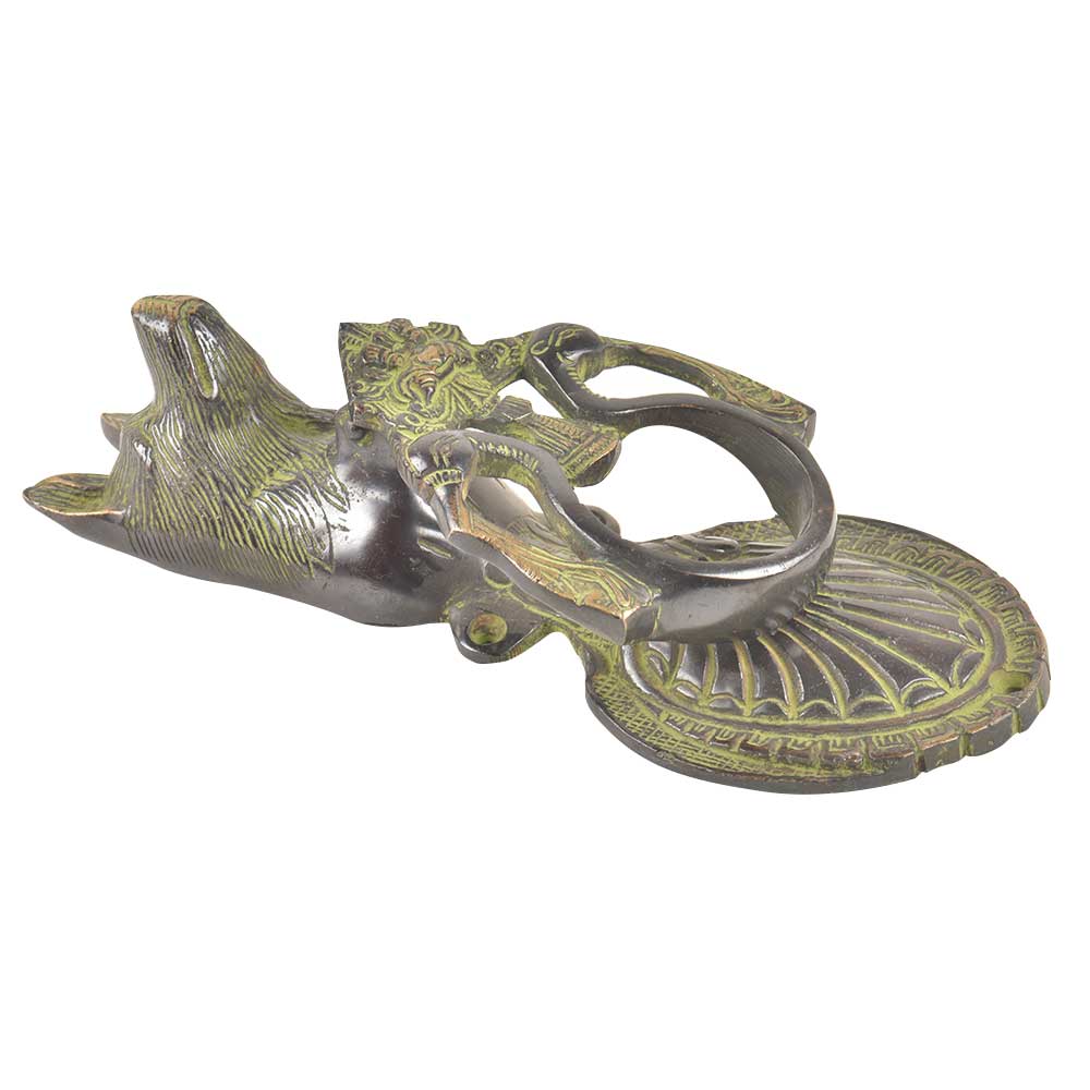 A truly breathtaking door knocker with a majestic Dog with a solid brass ring with peacock design on the knocker.Extremely high quality structure, making sure you can both enjoy its pleasing looks and flawless functionality. It was handcrafted with utmost attention to the detailing.