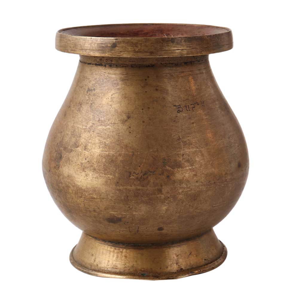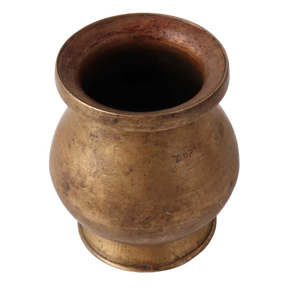 A brass South Indian pot, also known as a "lota" or "kalash," is a traditional container used for a variety of purposes in South Indian households. It is typically made of brass, a metal alloy composed primarily of copper and zinc, and is known for its durability and resistance to corrosion. The pot has a wide base and a narrow neck, and is often decorated with intricate designs and patterns. It is commonly used for storing and serving water, but can also be used for storing other liquids such as milk or yogurt, or for cooking and serving food. Due to its durability and cultural significance, brass South Indian pots are often passed down through generations as heirlooms.