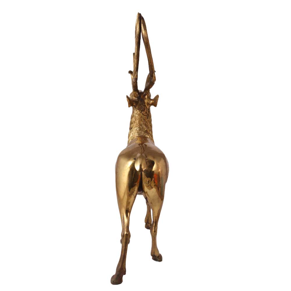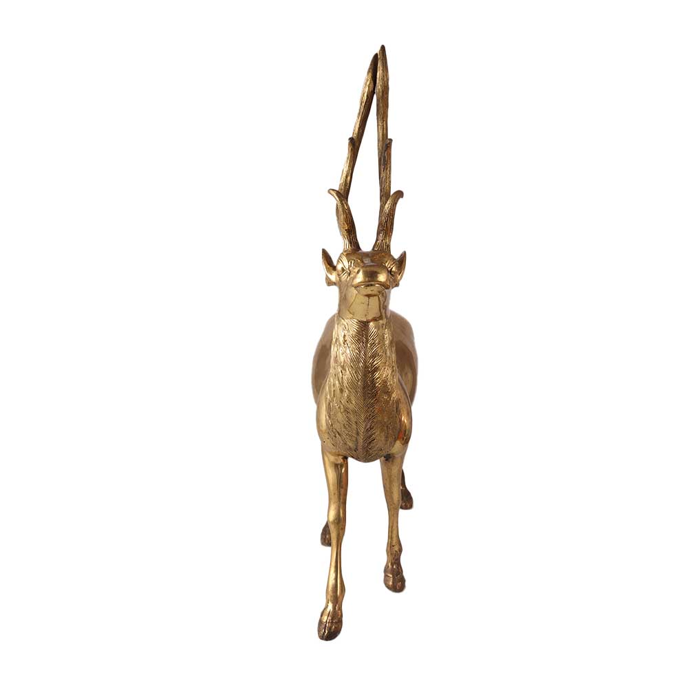Beautiful and sophisticated, the standing Brass Golden Deer Statue is the ideal way to add a touch of class to any space. The bronze statue depicts a standing deer with its head held high and its antlers extending outward in a detailed design. The statue is ideal for indoor use; in addition to being used as a garden statue to add a touch of nature to any outdoor space, it can be placed on a table, shelf, or mantel. Brass is a strong, long-lasting material that is ideal for both indoor and outdoor use. The indian statue is portable and convenient to move and set up. The statue has a warm, welcoming appearance thanks to its golden finish that goes with any interior design. All things considered, the standing Brass Golden Deer Statue gift is a lovely and distinctive statue that will add a touch of class and sophistication to any space.