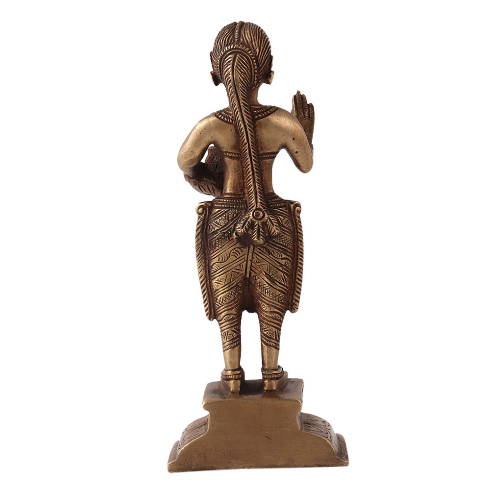 Brass sculpture of a standing lady holding a water pot in her left hand. This statue was made of high quality brass using ancient techniques with intricate details. A wonderful piece to decorate on a table, shelf or altar. Display the statue in your living room and it will be an eye catcher for your guests. A beautiful rustic looking piece for your vintage collection. Ideal for collections, decorations and individual gifts for all special and festive occasions.
