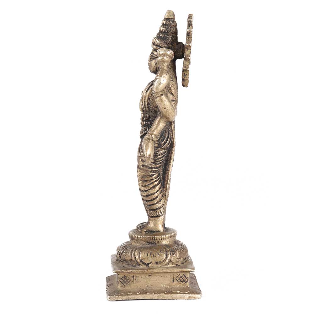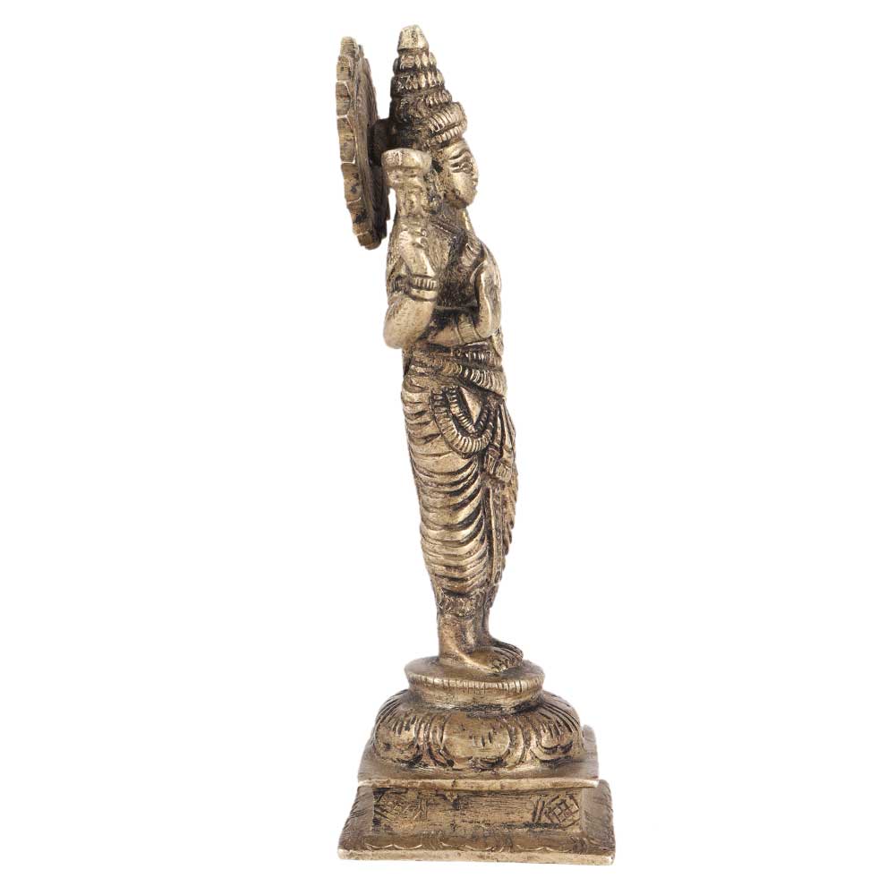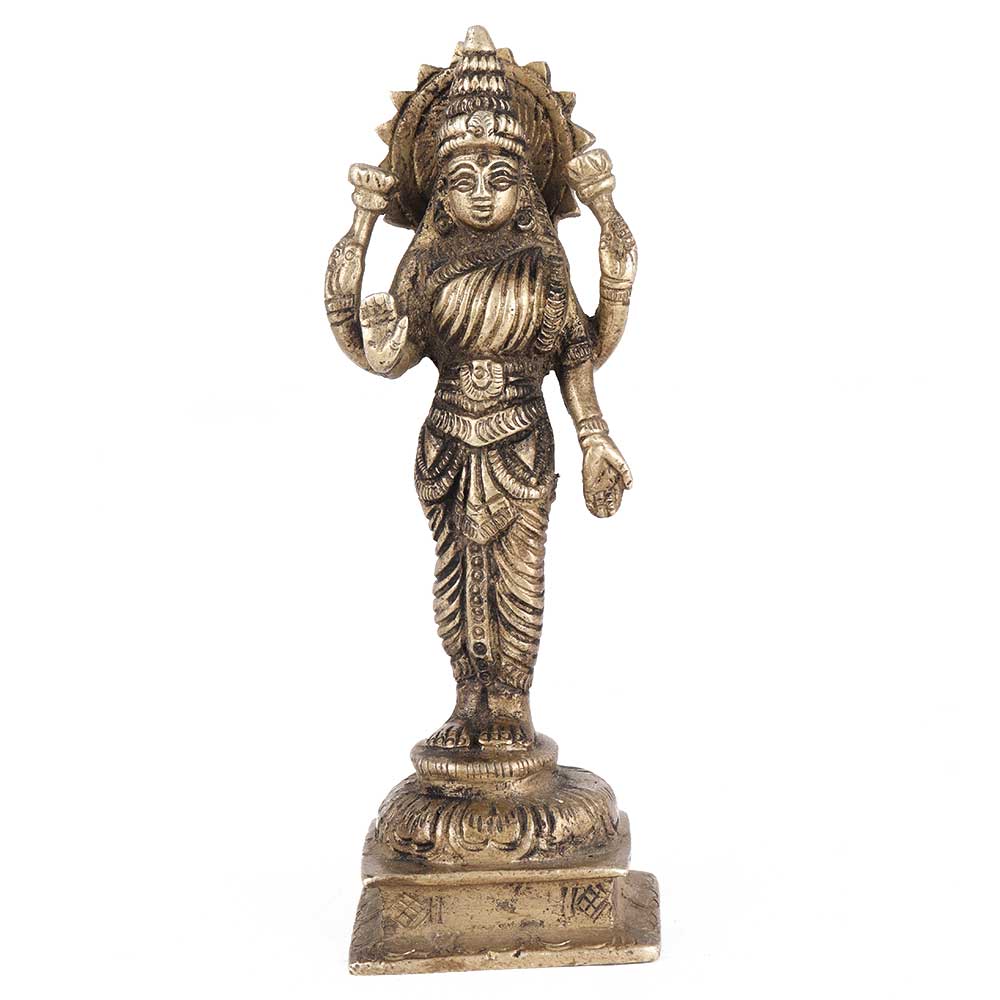 Intricate brass Devi Lakshmi idol depicting Lakshmi standing on a pedestal with four hands holding lotus buds and demonstrating Abhaya Varada mudra denoting prosperity and security. The engravings are intricate, with textile patterns, jewellery, a crown, and other distinct details of devi. This brass Lakshmi idol can be used for everyday puja. Worshiping with this brass statue of Lakshmi may bring us enormous blessings and material fortune to help us overcome our poverty and problems.Â