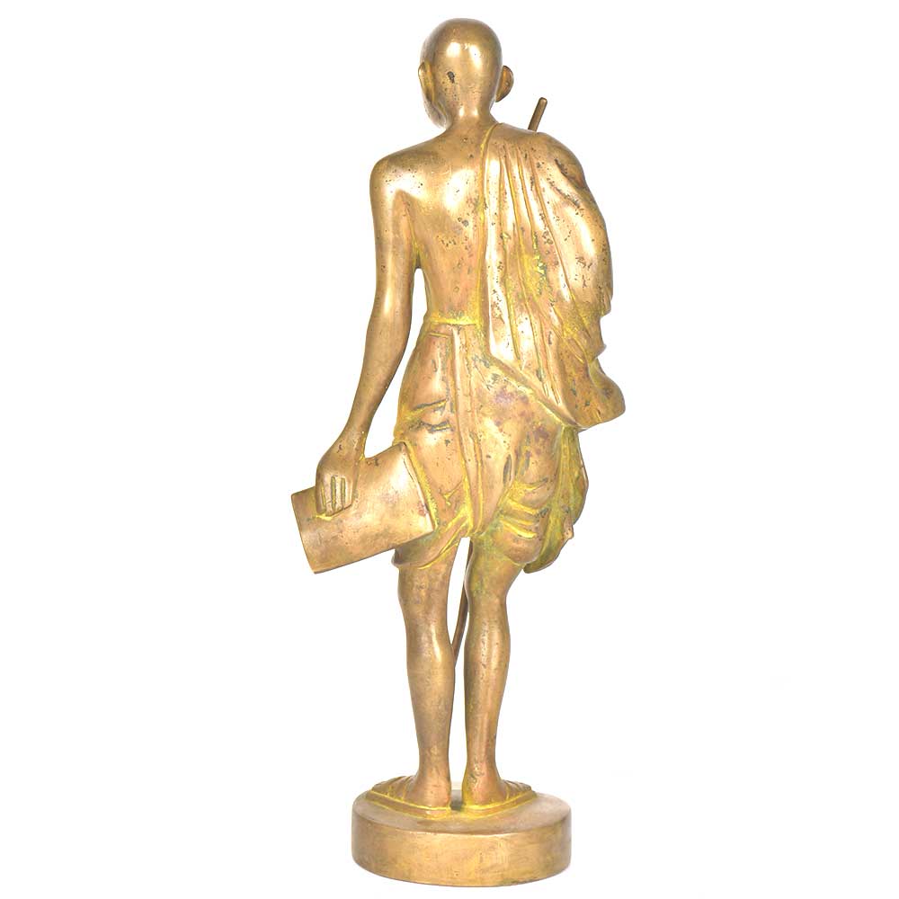 Standing statue of Mohandas Karamchand Gandhi with a book in his hand and a stick to walk. This statue is made of brass with fine and excellent detailings with some patina and he was also known as Gandhi ji or Bapu.