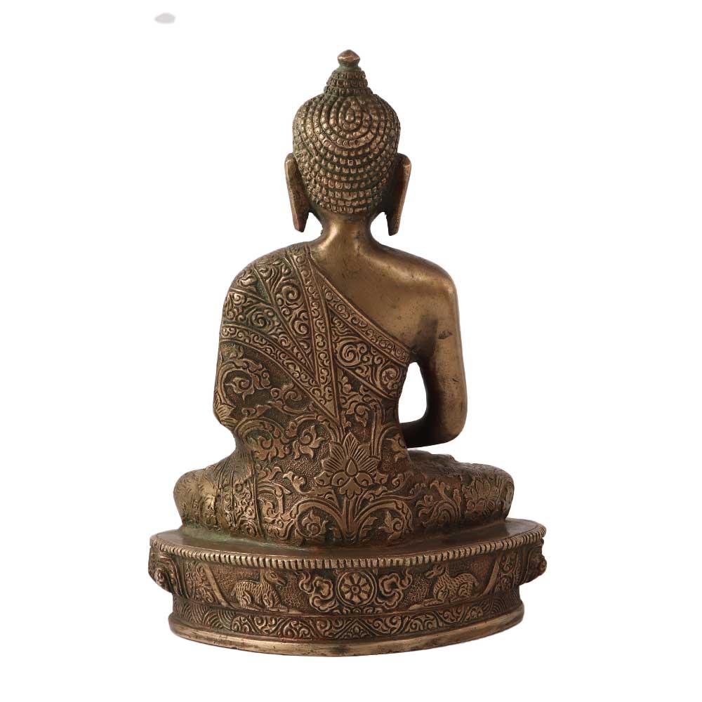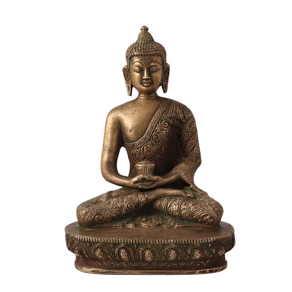 Meditation with Lord Buddha and Pindapatra is a spiritual practice in Buddhism where one offers food and other items to the Buddha or other spiritual beings as an act of devotion and to accumulate merit. Pindapatra refers to a small plate or bowl that is filled with offerings such as flowers, incense, and food. During meditation, the devotee focuses their thoughts on the Buddha and the act of offering, helping to cultivate mindfulness and concentration. The brass material gives the statue a warm, radiant appearance, making it an attractive focal point for meditation or spiritual practice. The statue of the meditating Buddha represents peace, compassion, and wisdom and is believed to bring positive energy and blessings to its surroundings. The presence of the Pindapatra emphasizes the act of offering, reminding the observer of the importance of generosity and selflessness in Buddhist teachings. Overall, the meditating Lord Buddha with Pindapatra statue in brass is a powerful symbol of the Buddhist faith.