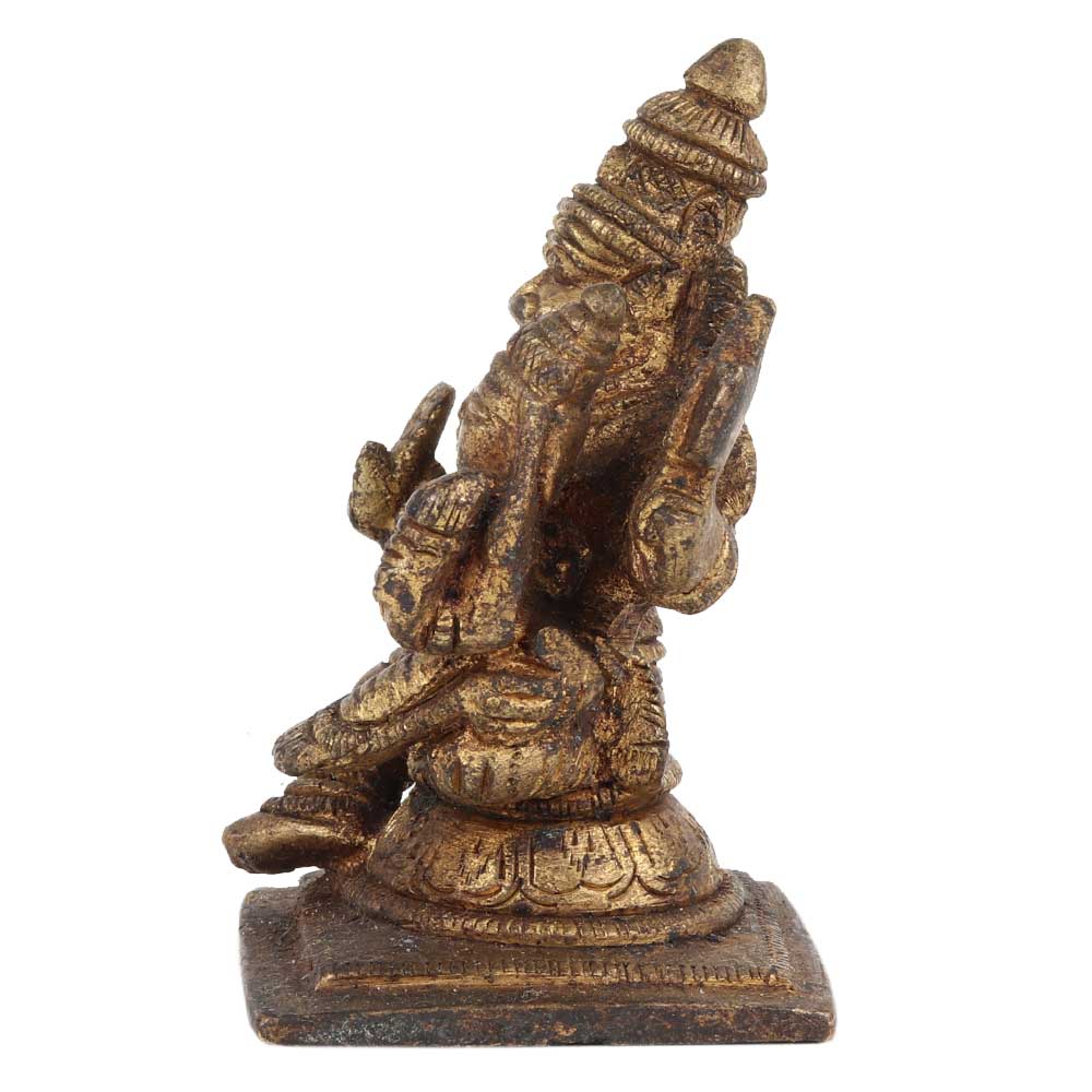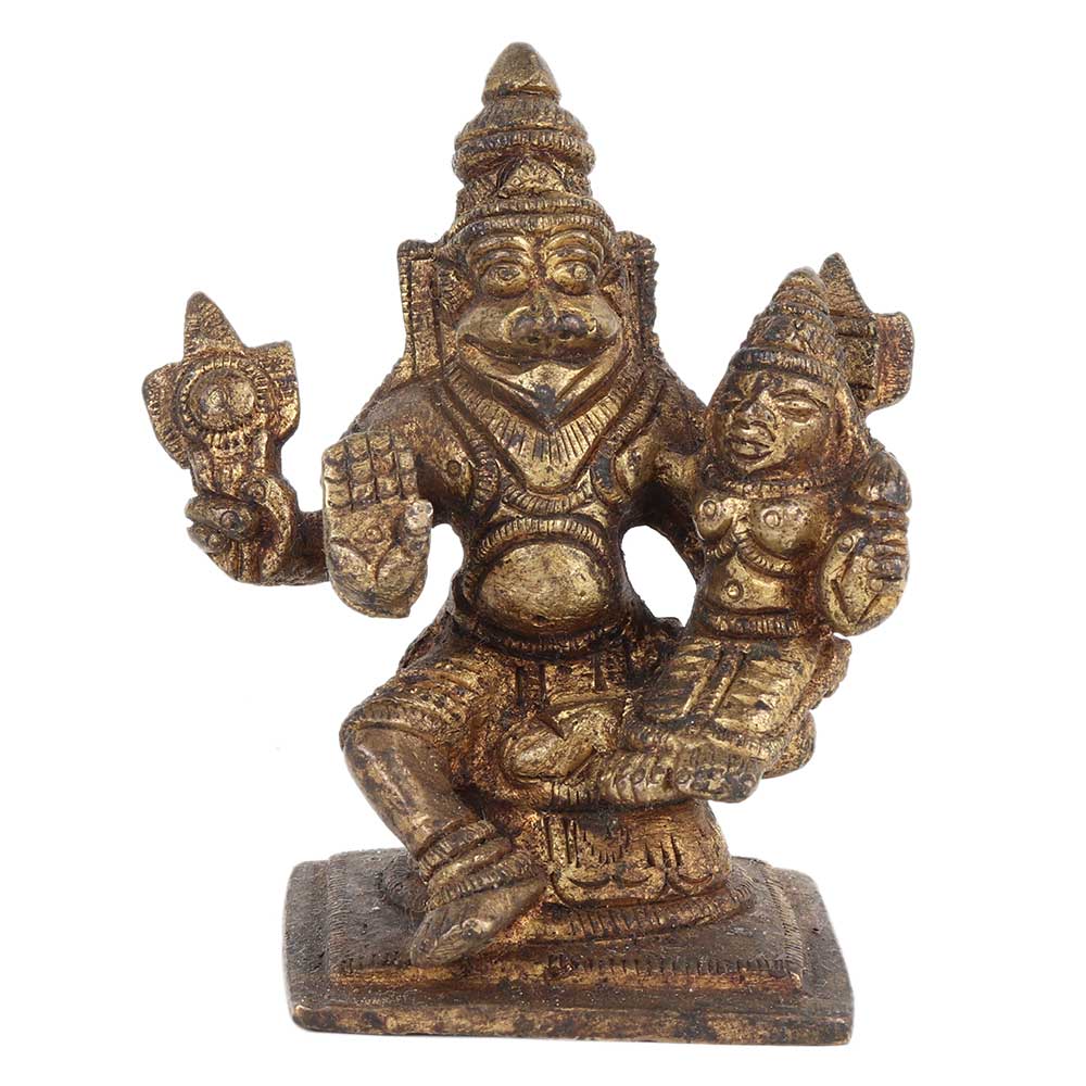 Brass Statue of Narsimha is the avatar of Vishnu with Lakshmi on his Lap is an Ideal home decor product and also a great collectable. Lord Vishnu is shown with four hands the rear hands are shown holding shankh and chakra and the right hand is in abhaya mudra and the left hand is used for holding goddess laxmi as she sits on his lap.
